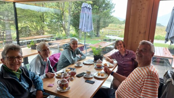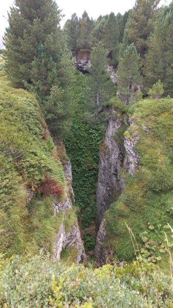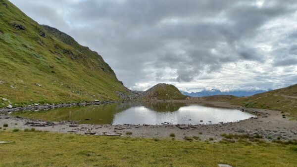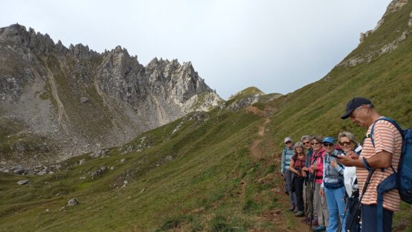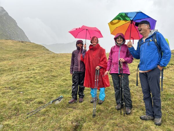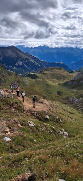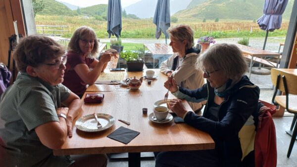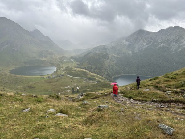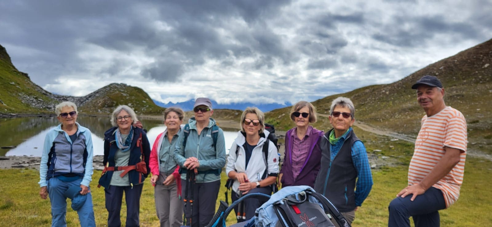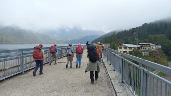 Am nächsten Morgen schien sogar die Sonne zwischen den Wolken und wir starteten mit einem bequemen Weg zum Passo delle Columbe. Auch dort gab es wieder einen See, den Lago di Campanitt, mit Fotohalt. Da sich die grauen Wolken näherten, machten wir nur einen kurzen Halt und wanderten über einen neu gemachten zickzack-Weg hinunter in die weite Hochebene der Piano dei Canali. Zum Teil wirkte der Weg wie mit Zucker bestreut, da der zuckermässige Piorasand mit dem Regen auf dem Weg verteilt war. Als wir unten in der Hochebene eine Pause machten setzte der Regen sachte wieder ein. Glücklicherweise dauerte er nicht lange und beim Mittagshalt auf der Alpe Gana konnten wir wieder etwas Sonne geniessen. Der letzte Wegteil führte uns auf einem Sentiero naturalistico Lucomagno durch ein Naturschutzgebiet, mit einigen grossen Dolinen, die zum Teil sehr tief waren. Das letzte Stück von der Alpe Croce zum Lukmanierpass wanderten wir nochmals im Regen. Glücklich kamen wir auf dem Lukmanierpass an und konnten noch im Restaurant ein Zvieri geniessen, bevor wir mit dem Bus Richtung Biasca-Bellinzona die Heimreise antraten.