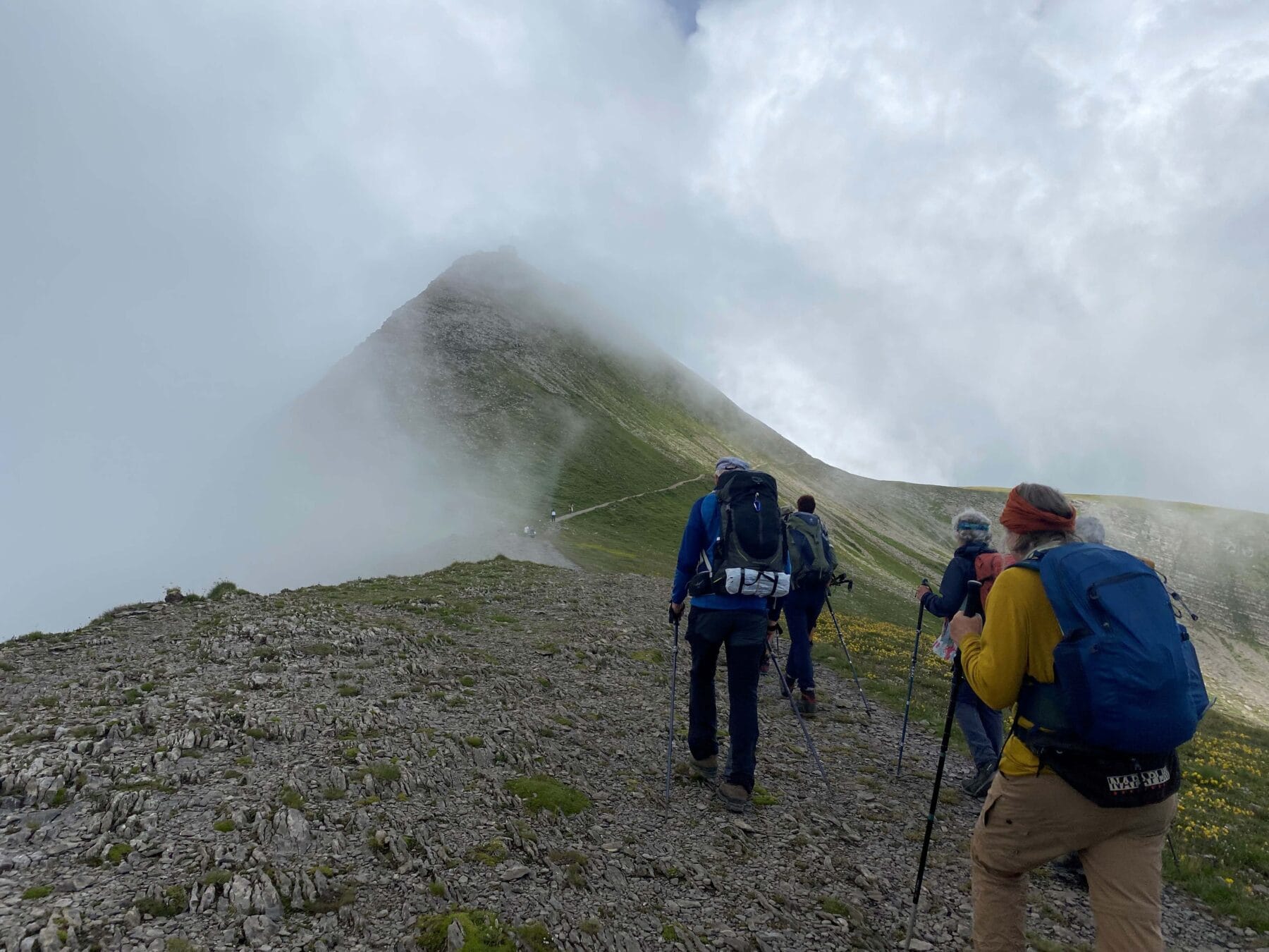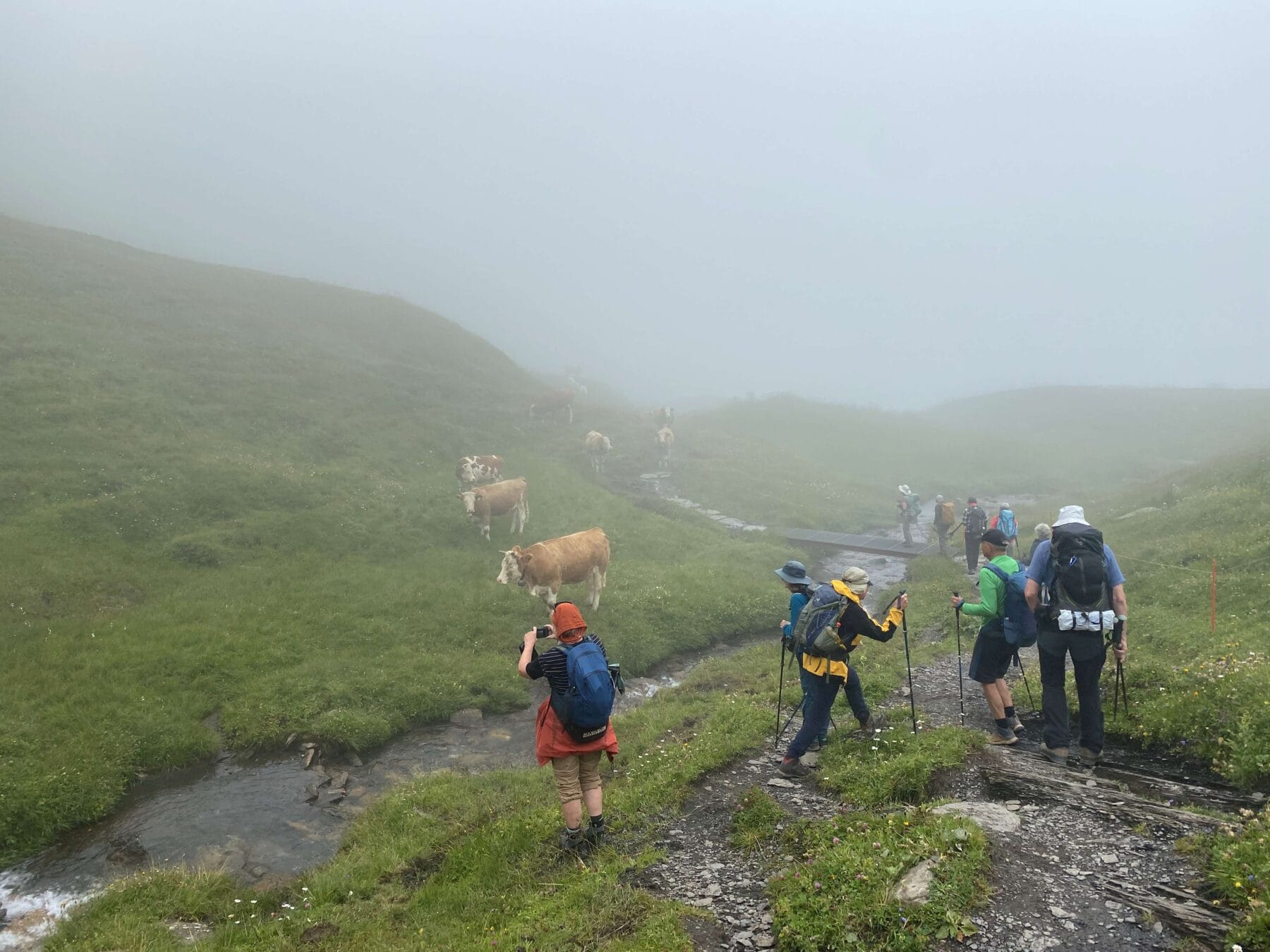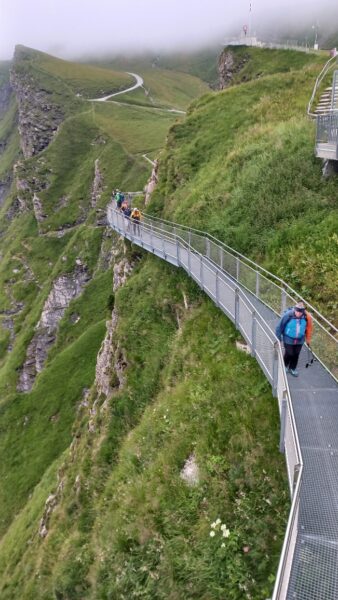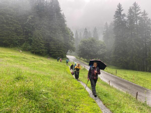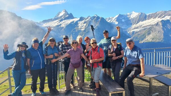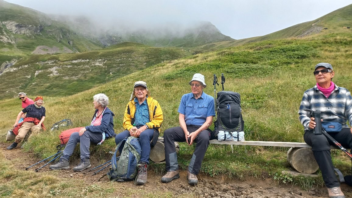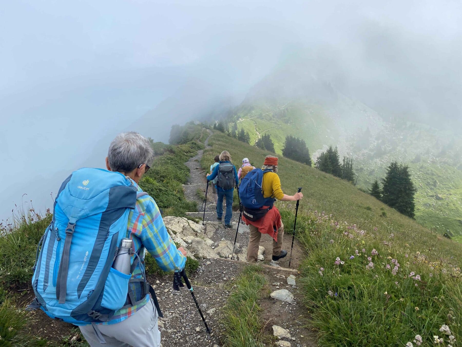 Am 22. Juli 2025 fuhren 11 Teilnehmende wohlgelaunt und frischen Mutes zur Schynigen Platte und unsere Wanderung begann. Es war zwar etwas bedeckt bis neblig, aber einen 1. Fotohalt gab es bereits beim Sky Walk hinter dem Hotel Schynige Platte. Nun folgten wir auf dem Gratweg der Via Berna, einmal sahen wir den Thunersee, das nächste Mal den Brienzersee, manchmal auch beide kurz zusammen, dann verschwand alles wieder hinter den Wolken, so dass unsere Wanderung sehr mystisch war. Beim nächsten Halt konnten wir einen kurzen Blick auf den Eiger werfen, dann war er wieder verschwunden. Beim Gotthard mit Blick auf den Sägistalsee, manchmal auch Brienzersee, machten wir einen kurzen Mittagshalt bevor wir zur Männdlenen Hütte weiter wanderten, wo wir einen Stopp machten und uns verpflegen konnten mit Suppe oder Kuchen und Getränken. Dann ging es weiter Richtung Faulhorn, welches nur 4 Unentwegte bestiegen, da der Gipfel im Nebel lag. Weiter ging es in kleinen Gruppen zum Bachalpsee, der am Dienstag nicht zum Baden einlud und endlich erreichten wir Grindelwald First und hatten den Skywalk und die Aussichtsterasse für uns alleine (nur leider sahen wir ausser grauen Wolken nichts) Im Berggasthaus wurden wir sehr freundlich und aufgestellt empfangen. Wir wurden zu den Zimmern geführt und konnten in 2 Bettzimmern und einem 3 Bettzimmer übernachten. Beim Abendessen war der Service sehr kommunikativ und ging auf unsere Wünsche ein. Wir fühlten uns schnell wohl.
