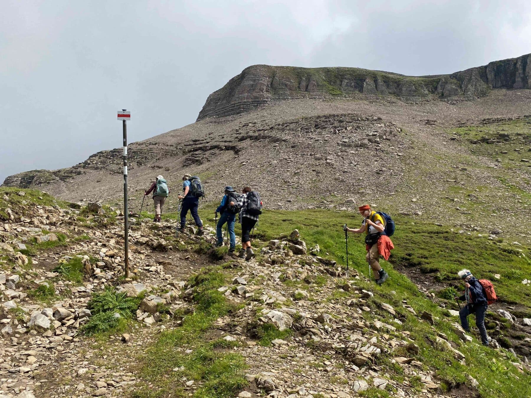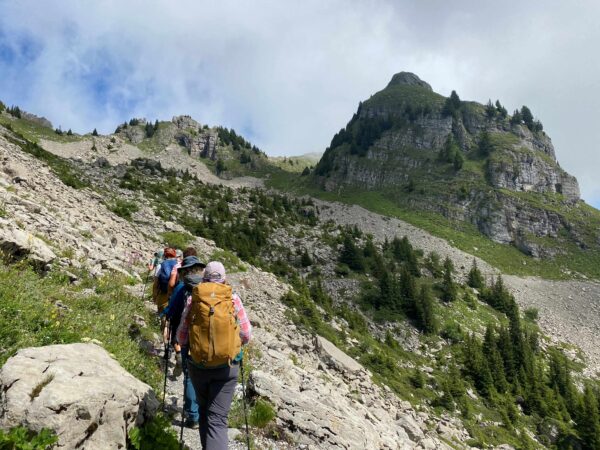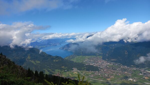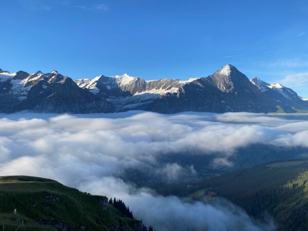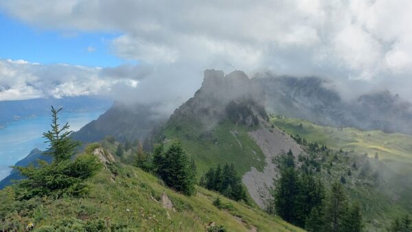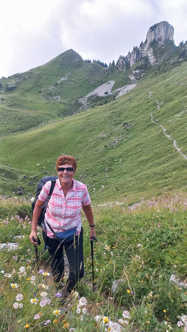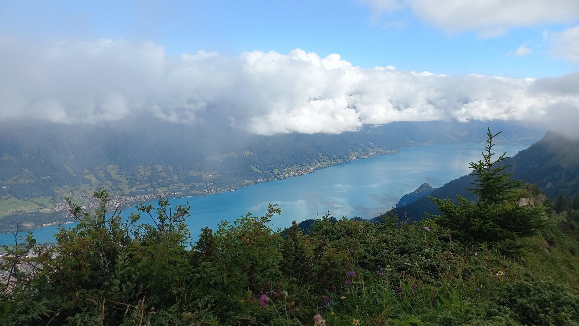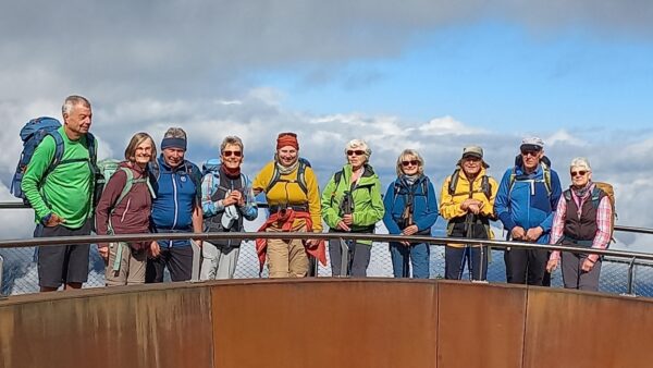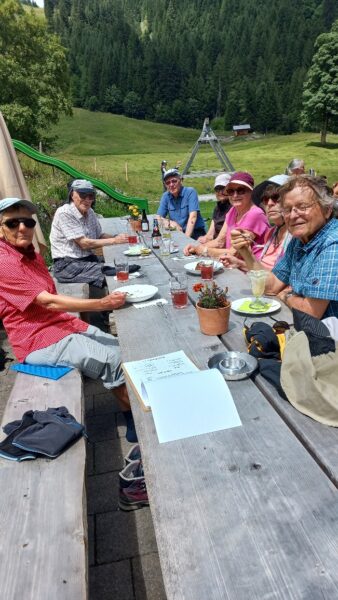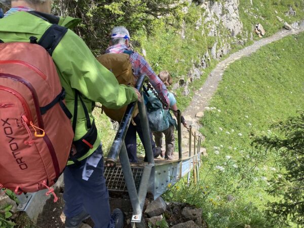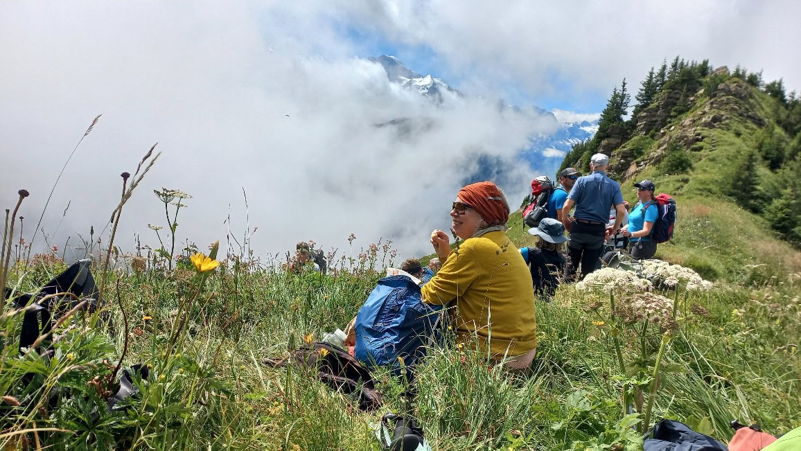 Am 22. Juli 2025 fuhren 11 Teilnehmende wohlgelaunt und frischen Mutes zur Schynigen Platte und unsere Wanderung begann. Es war zwar etwas bedeckt bis neblig, aber einen 1. Fotohalt gab es bereits beim Sky Walk hinter dem Hotel Schynige Platte. Nun folgten wir auf dem Gratweg der Via Berna, einmal sahen wir den Thunersee, das nächste Mal den Brienzersee, manchmal auch beide kurz zusammen, dann verschwand alles wieder hinter den Wolken, so dass unsere Wanderung sehr mystisch war. Beim nächsten Halt konnten wir einen kurzen Blick auf den Eiger werfen, dann war er wieder verschwunden. Beim Gotthard mit Blick auf den Sägistalsee, manchmal auch Brienzersee, machten wir einen kurzen Mittagshalt bevor wir zur Männdlenen Hütte weiter wanderten, wo wir einen Stopp machten und uns verpflegen konnten mit Suppe oder Kuchen und Getränken. Dann ging es weiter Richtung Faulhorn, welches nur 4 Unentwegte bestiegen, da der Gipfel im Nebel lag. Weiter ging es in kleinen Gruppen zum Bachalpsee, der am Dienstag nicht zum Baden einlud und endlich erreichten wir Grindelwald First und hatten den Skywalk und die Aussichtsterasse für uns alleine (nur leider sahen wir ausser grauen Wolken nichts) Im Berggasthaus wurden wir sehr freundlich und aufgestellt empfangen. Wir wurden zu den Zimmern geführt und konnten in 2 Bettzimmern und einem 3 Bettzimmer übernachten. Beim Abendessen war der Service sehr kommunikativ und ging auf unsere Wünsche ein. Wir fühlten uns schnell wohl.