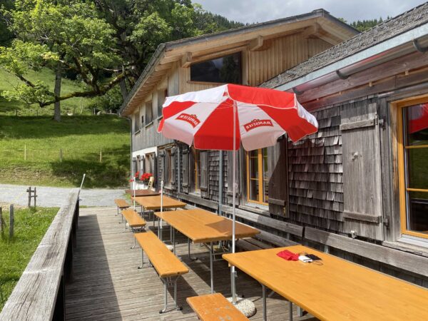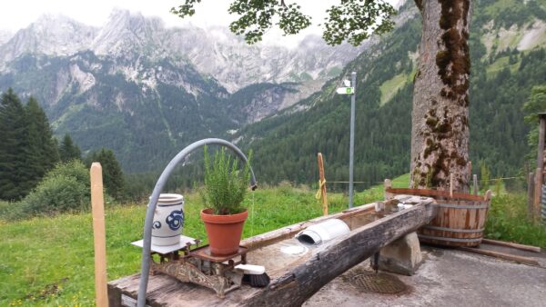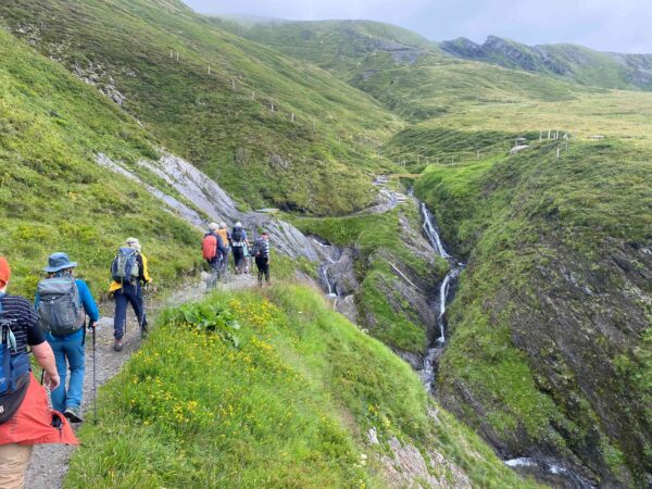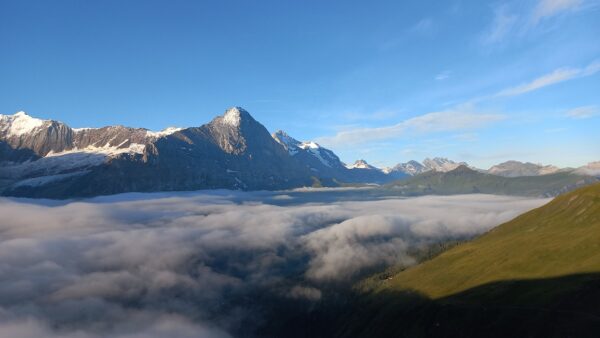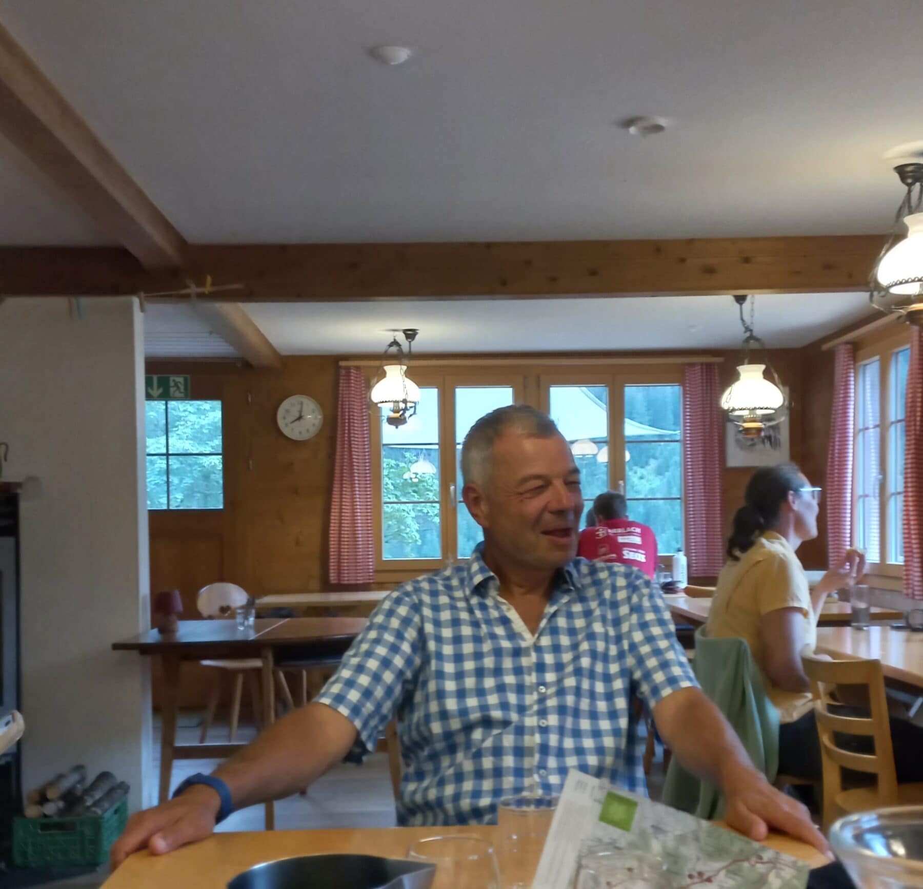 Am nächsten Morgen, welche Überraschung, schien die Sonne… es hatte anfangs kaum Wolken am Himmel und wir konnten eine fantastische Aussicht geniessen mit Blick zu den berühmten Berner Gipfeln wie Eiger, Mönch, Jungrau, Wetterhorn, Schreckhorn und vielen weiteren, dann bildete sich immer mehr ein Nebelmeer. Einige starteten zum Fotoshooting bereits vor dem Zmorge, denn wir hatten die ganze Aussichtsterasse praktisch für uns. Nach einem feinen Zmorgen zogen die ersten Wolken auf. Dann starteten wir mit der Wanderung Richtung grosse Scheidegg, sahen unterwegs ein paar Gämsen zwischen den Kühen und entschieden uns auf dem Via Berna Weg zu bleiben, denn Richtung Hornweseeli türmten sich die Wolken auf. Ab der grossen Scheidegg war der Weg besonders schön, über Weiden mit vielen Blumen, dann wieder durch den Wald oder dem Reichenbach entlang gelangten wir schliesslich nach einem Picnic Halt zur Schwarzwaldalp, wo wir auf Roland und Irene trafen. Roland hatte die Tour geplant und konnte sie nicht mehr selber leiten, so dass ich sie übernommen habe. Nun machten wir mit beiden einen Zvierihalt im Restaurant. Roland und Irene verabschiedeten sich und nahmen den Bus zurück nach Grindelwald. Wir besichtigten noch die alte Sägerei auf der Schwarzwaldalp bevor wir uns zur Brochhütte aufmachten, wo wir für die 2. Nacht eine gemütliche Unterkunft vorfanden. Heidi und Res begrüssten uns freundlich und zeigten uns die Zimmer. Nun hatten wir bis zum Abendessen noch viel Zeit, um uns zu entspannen, die Umgebung auszukundschaften oder eine Pause zu machen. Es gab ein feines 4 Gang Menü. Wir wurden richtig verwöhnt.