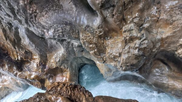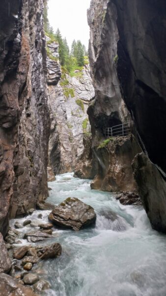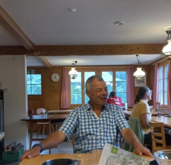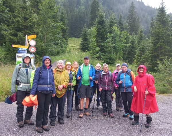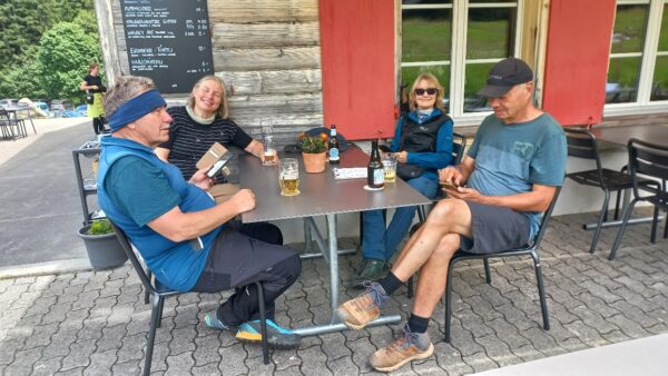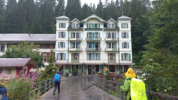 In der Nacht fing der Regen an und morgens war alles wieder grau. Nach einem feinen Zmorge starteten wir mit leichtem Nieselregen Richtung Rosenlaui Schlucht. Dort besichtigten fast alle die spektakuläre Gletscherschlucht, das Wasser rauschte mit grosser Wucht an uns vorbei. Der Weg war gut abgesichert. Anschliessend trafen wir uns wieder im Hotel Rosenlaui und konnten den wunderschönen Eingangsbereich und das Restaurant bewundern. Nach einem Getränk von Laurent und Renate offeriert, setzten wir unsere Wanderung bei leichten und manchmal etwas stärkerem Regen fort. Von nun an verabschiedeten sich an jeder Bushaltestelle einige Teilnehmende, so dass wir nur zu fünft in Zwirgi ankamen und uns dort mit einem feinen Essen stärkten. Schliesslich gelangten wir alle 5 nach Meiringen und traten zufrieden die Heimfahrt an.