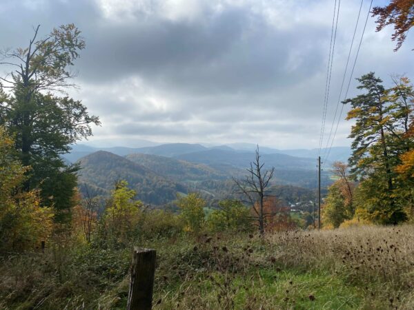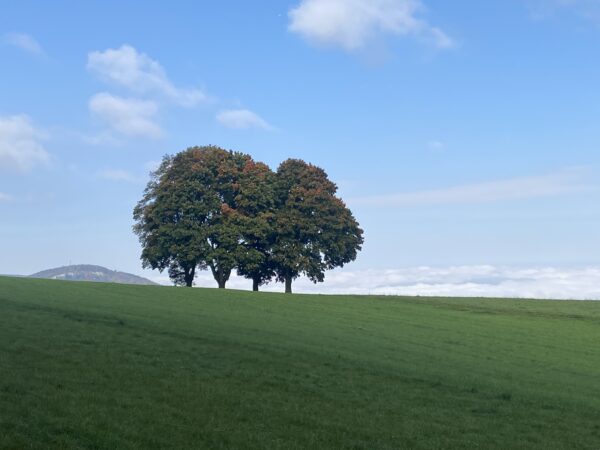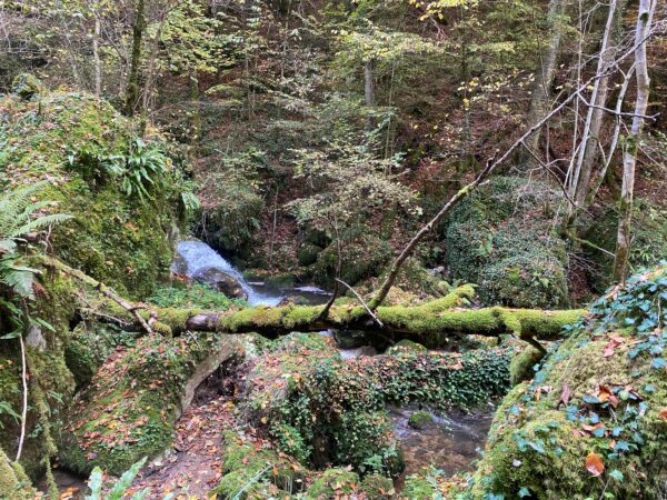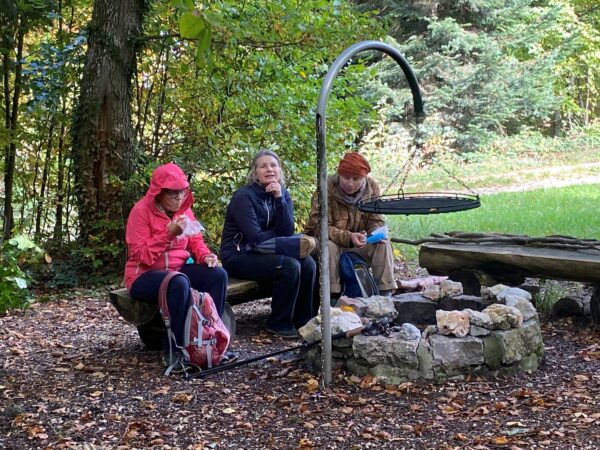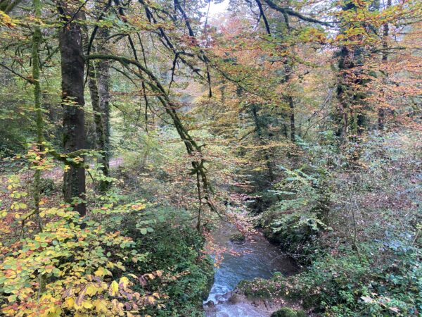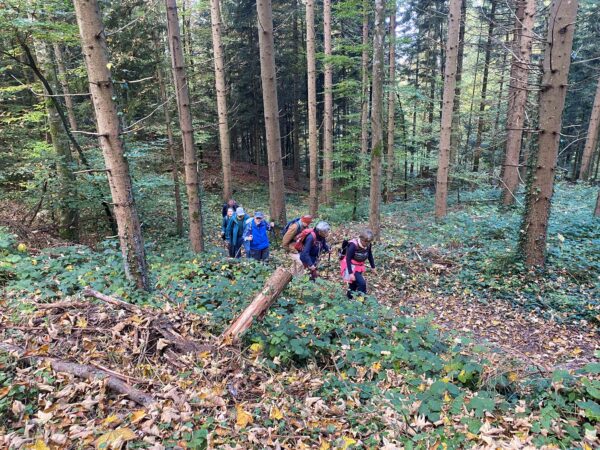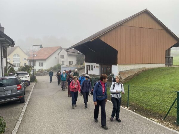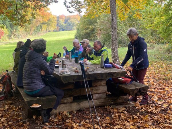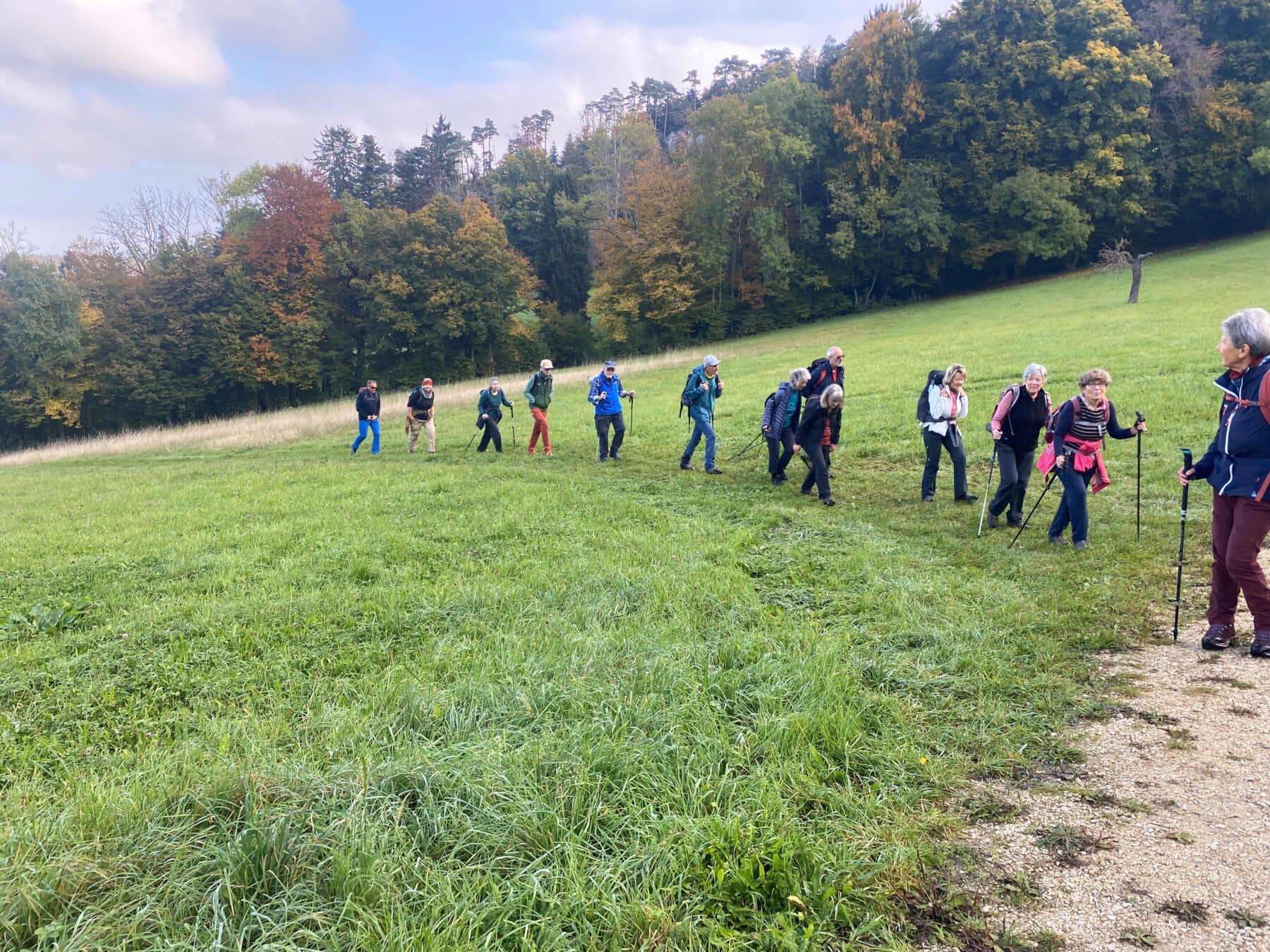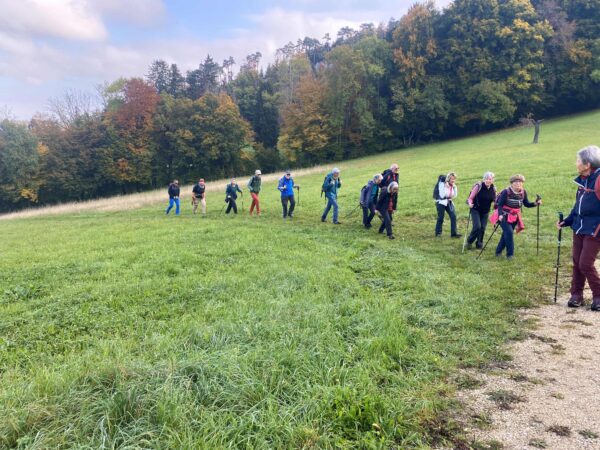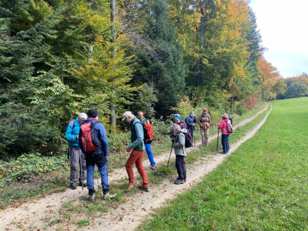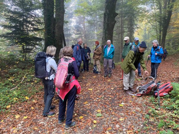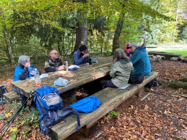 Die S3 fährt durchgehend, und die Anreise nach Duggingen ist wieder ohne viel Umsteigen möglich. Nach einer kurzen Begrüssung, insbesondere von zwei neuen Teilnehmerinnen, steigen wir durchs Dorf auf. Wir gelangen auf die Hochebene Ufem Berg. Dabei stecken wir im Nebel. Die Stimmung ist herbstlich, aber halt ohne Aussicht. Mit wunderbaren Herbstfarben wartet auch der Wald auf uns. Beim Baslerbrünneli gibt’s einen ersten Halt. Hier, und an einigen anderen Orten, weist der Wanderleiter auf einige geschichtliche Hintergründe hin, so zum Beispiel was es mit dem Baslerbrünneli, dem Seewener See und dem Wälschhans auf sich hat. Bald ist das Sertel erreicht. Der Wanderweg folgt hier dem Seebach. Gegen den Wälschhans hin wird’s steiler und gerne schalten wir beim Forsthaus eine Pause ein.