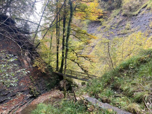 Unser nächstes Ziel ist das Chastelbachtal. Auf manchmal breiten, manchmal sehr schmalen Weglein gelangen wir in der Nähe der Steffenschmitte zur Hauptstrasse hinunter. Dieser müssen wir ein Stück weit folgen, bevor wir zum Chastelbach absteigen können. Wir folgen dem romantischen Weg. Eine gewisse Konzentration ist wegen der Nässe aber erforderlich. Schliesslich verlassen wir den Chastelbach und wenden uns gegen Osten. Auf dem Schlifweg, zuletzt auf der Hohlen Gasse wandern wir dem Ziel, dem Bahnhof in Grellingen, entgegen. Ein Schlusstrunk im Bahnhofsbistro, den wir jetzt an der wärmenden Sonne geniessen können, rundet die Wanderung ab.