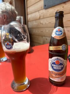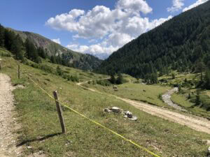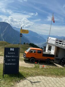 Ein letztes Zuwinken von Wandernden, dann gilt die volle Konzentration dem verblockten aber fahrbaren Trail hinunter nach Fleschboden (2134m). Die letzte Tankstelle vor dem Parkplatz, steht da auf der Tafel vor dem Restaurant. 80 % der Biker hätten keine Bremsen und fahren am Restaurant vorbei, meint der Beizer. Wir nehmen uns Zeit und geniessen ein erfrischendes Bier an der Sonne.