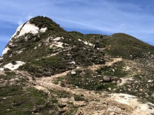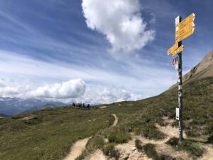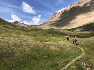 Ab Heiligkreuz verläuft die Route auf der anfänglich recht steilen Alpstrasse zur Alp Sickerchäller 1940m. Nach einer ausgiebigen Pause steigen wir wieder in die Pedale und treiben unsere «Batterie-Rösser» in mehreren Kehren das nun steilere, steinige Alpsträsschen hoch. Die Landschaft wird karger und die letzten ca. 200 Hm sind auf einem schönen recht gut fahrbaren Trail zu bewältigen.