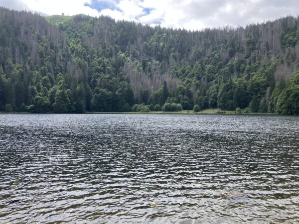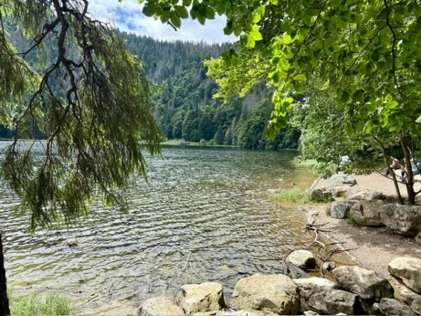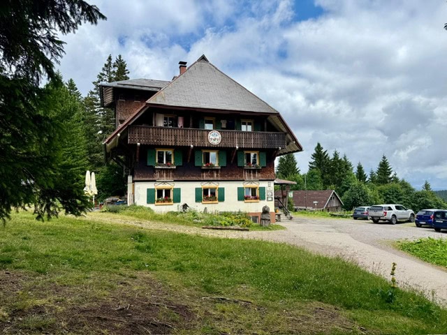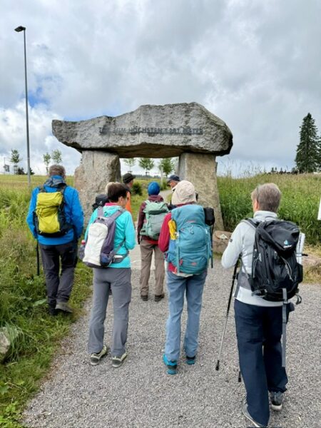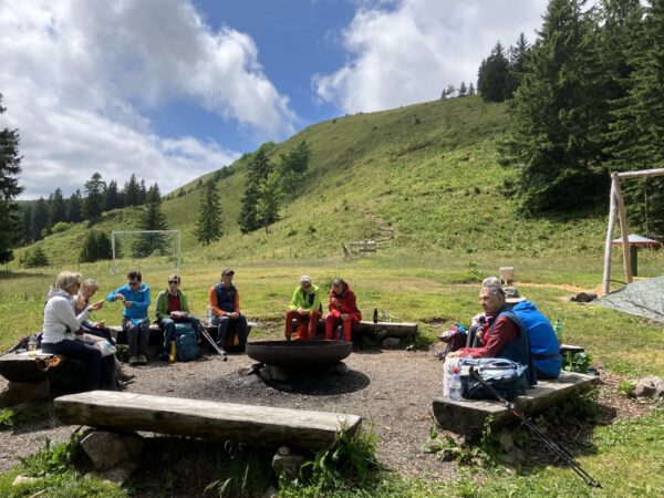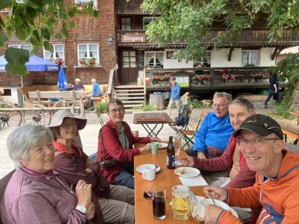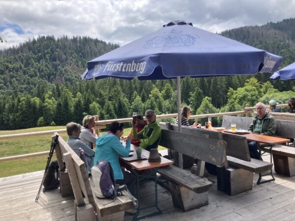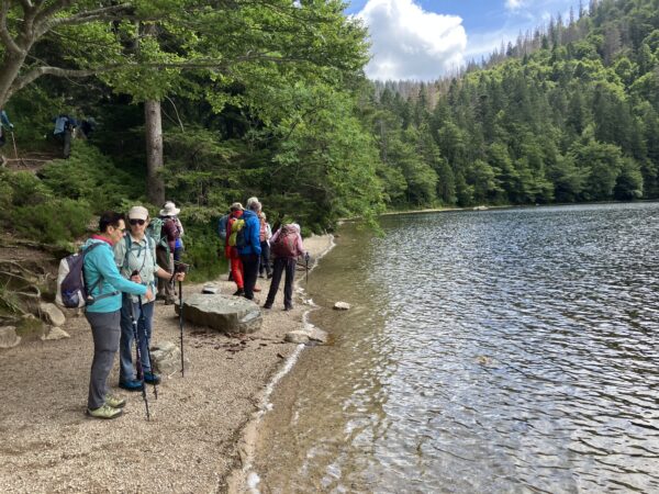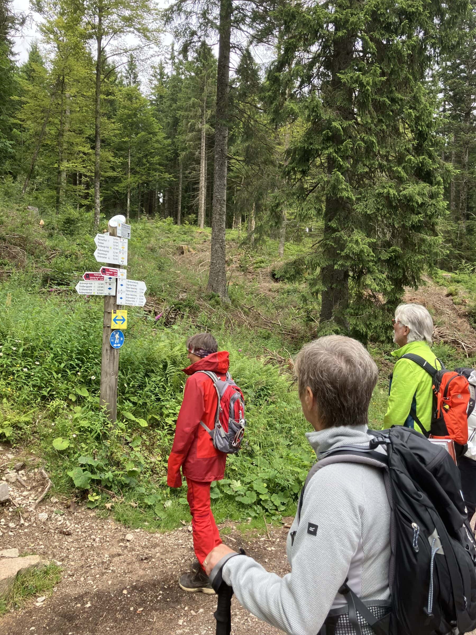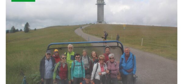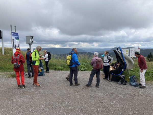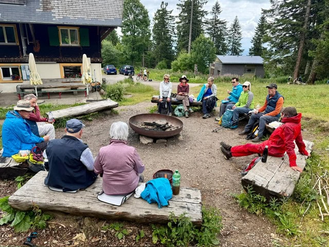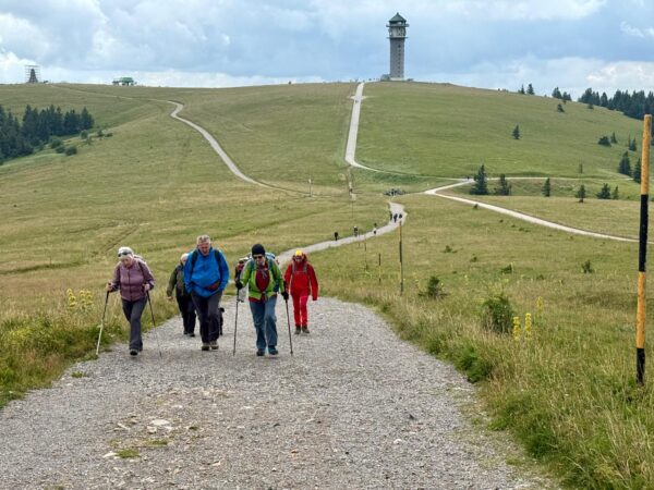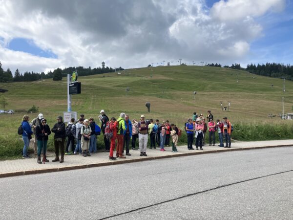 Bei der Bergstation des Sesselliftes konnten wir ein Gruppenfoto auf einer «Verkehrs-Radaranlage» auslösen, ja es wird heute alles für Touristen geboten. Über die Krete gelangten wir zum Hochplateau des Feldberges mit 1493m höchster Punkt im Schwarzwald, mit Fernsehturm und Wetterstation. Ja, die Rundsicht über Herzogenhorn / Blauen / Schauinsland ist einmalig. Nach einem Pfad über den Baldenweger Buck gelangten wir zur Hütte, wo ein schöner Grillplatz zum Mittagsmahl einladete. Der Strasse entlang ging es dann den Sägenbachtobel hinunter, der wie ein zweites Bachbett abenteuerlich und wildromantisch wirkte. Dem Waldweg entlang gelangten wir zum Raimatihof, wo wir uns noch mit einem Stück Kuchen für den steilen Aufstieg stärkten. Nach kurzem Marsch gelangten wir zum Feldsee, der wunderschön in diesem Talkessel liegt.