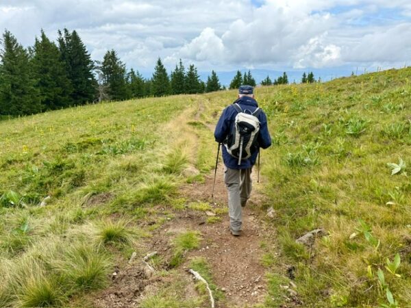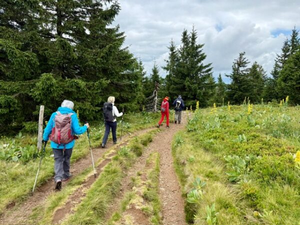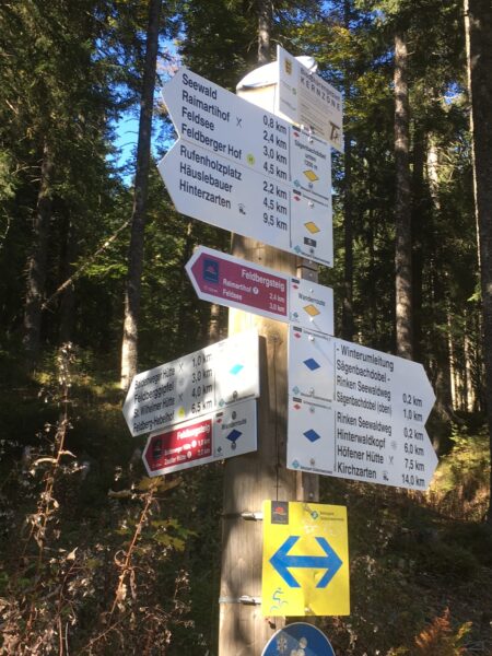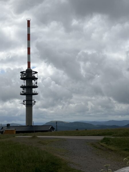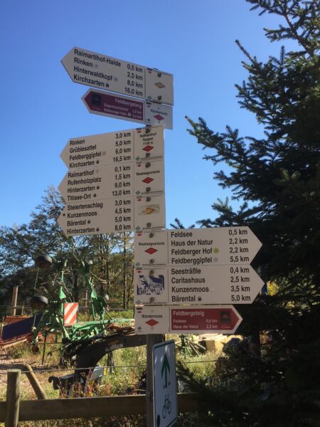 Route : Feldberghof / Busstation 1250m hinauf zu Bismarkdenkmal – Wetterstation / Fernsehturm 1493m – Baldenweger Buck 1460m / Hütte – Sägenbachtobel – Raimatihof 1110m – Feldsee – Feldbergsteig – Busstation