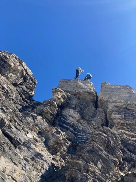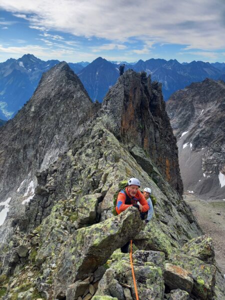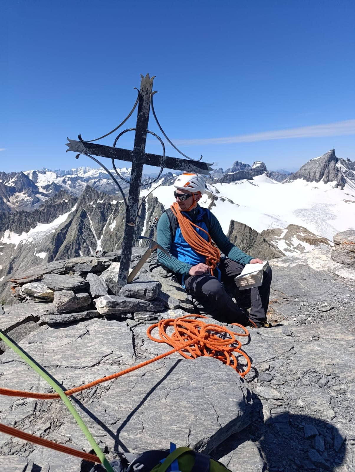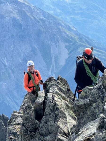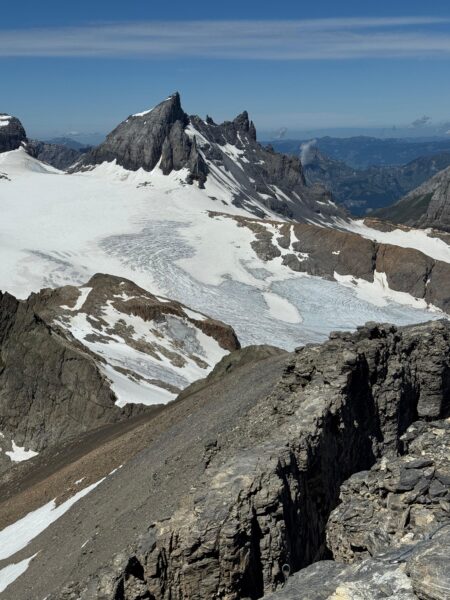 Start in der Morgendämmerung und angenehm frischer Temperatur. Blick Richtung Krönten und grosse Vorfreude auf die Kletterei keimt auf. Den Zustieg haben wir gemäss unserem Zeitplan erreicht. Am Schluss noch eine 40 Grad Schneeflanke und wir haben uns auf das Klettern vorbereitet. Zügig geht es nach oben, Seillänge um Seillänge um Seillänge. Es will gar nicht aufhören. Mehr oder weniger am Grat ausgesetzt. Griffiger Fels und genügend Bohrhacken. Ab und zu muss mit einer Schlinge eine eigene Zwischensicherung gemacht werden. Nach der Überschreitung des Chli Krönten folgt der Aufstieg über eine Firnflanke zum Westgrat des Krönten. Jan ermahnte uns, vorwärts zu machen. Und auf die Minute stehen wir gemäss unserer Zeitplanung auf dem Krönten. Einfach ein gutes Gefühl. Selbstverständlich studieren wir das wunderbare Panorama. Mit Hilfe vom Peakfinder sind schnell und zuverlässig alle sichtbaren Gipfel bestimmt. Der Abstieg zur Kröntenhütte zieht sich in die Länge. Die Unterkunft im Blickfeld will einfach nicht näher kommen. Der Höhenmeter zeigt nur langsam weniger Höhenmeter an. Doch endlich konnten wir nach 10 Stunden Tour von der Sonnenterasse glücklich und zufrieden bei einem „Plättli“ auf den Krönten hochschauen.