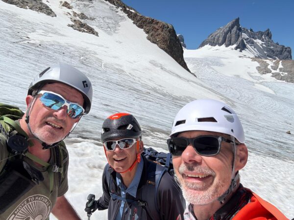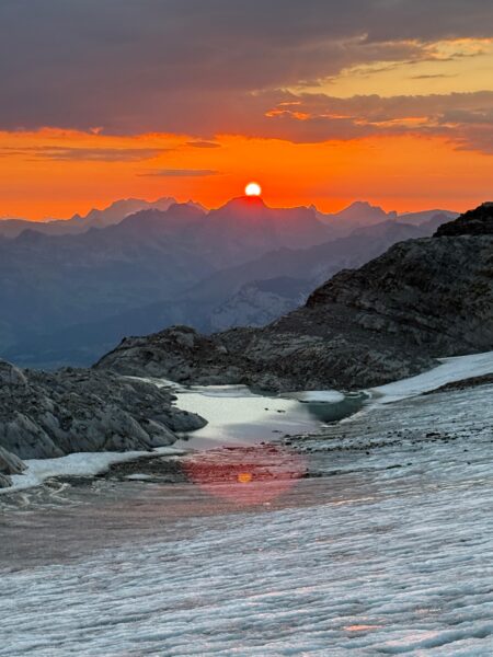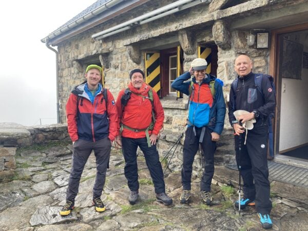 Tagwache 2.15 Uhr. Wir müssen um 13 Uhr in der Spannorthütte eintreffen, um nicht in ein prognostiziertes Gewitter zu kommen. Im Lichte der Stirnlampe und andächtig schweigend nach dieser kurzen Nacht, erreichen wir den Glatt Firn und seilen uns für den Gletscher an. Das Spannortjoch kommt näher. Doch nach vier Stunden sind wir am Punkt, wo die Kletterei angefangen hätte. Der Wetterradar zeigt immer noch starke Gewitter ab 13 Uhr, die Farben auf dem Bildschirm sind eindrücklich dunkel. Wir beschliessen, auf die Besteigung des Gross Spannort zu verzichten. und steigen zur Spannorthütte ab. Die Zeit ist zu knapp und die gestrige Tour hat körperlich ihre Spuren hinterlassen. Wir wollen nichts riskieren. Savety first ist unser Motto. Da wir schon um 11 Uhr auf der Terrasse der Spannort-Hütte selbstgemachten Kuchen geniessen, geht es vorzeitig nach Engelberg. Wir dürfen auf vier sehr schöne Tage zurückblicken. Unsere Truppe harmoniert. Wir haben es lustig zusammen, schmieden schon Pläne fürs 2026 und sagen Jan für seine tolle Arbeit als Bergführer Danke.