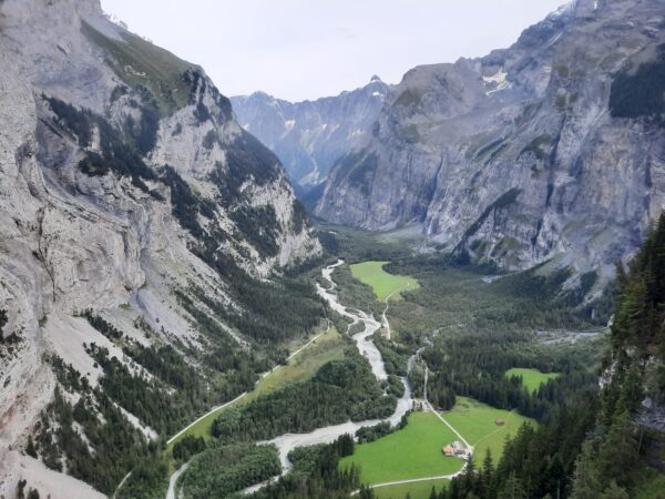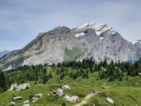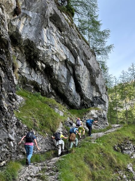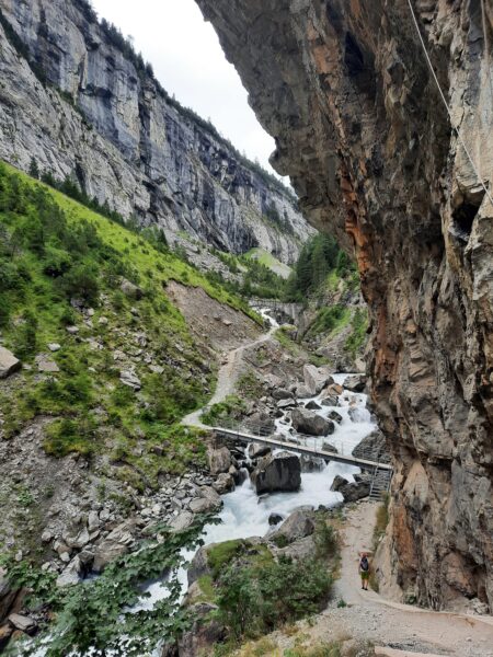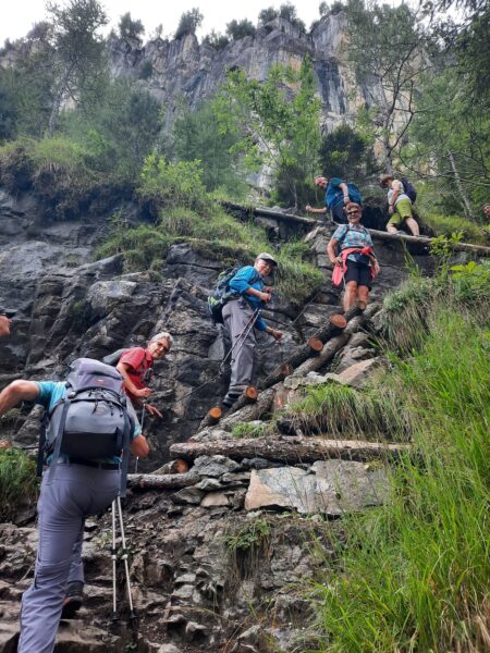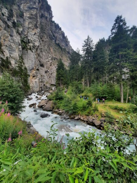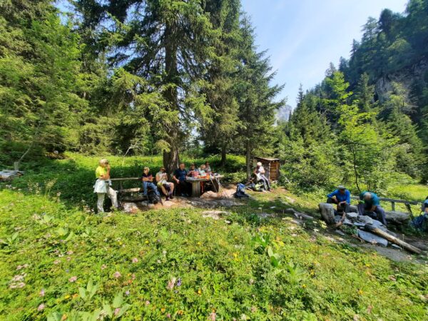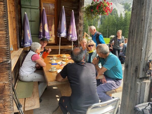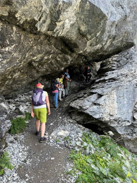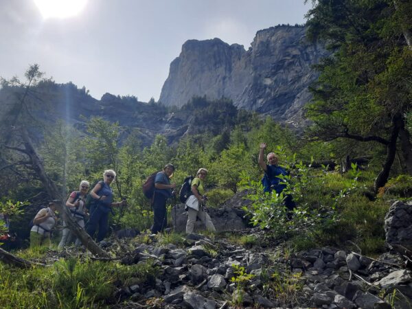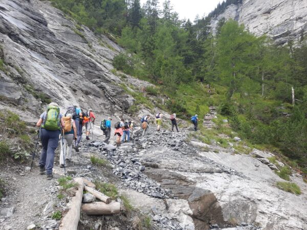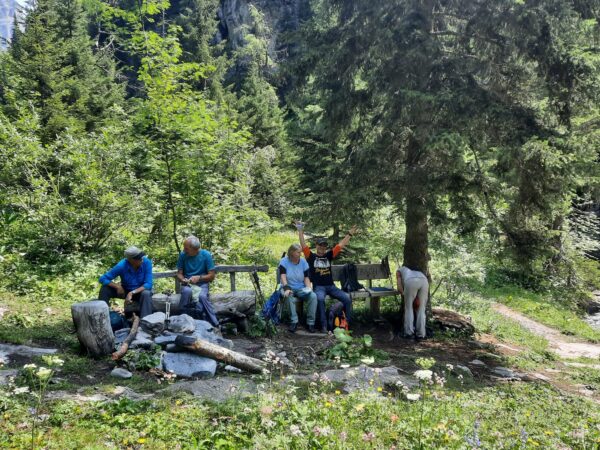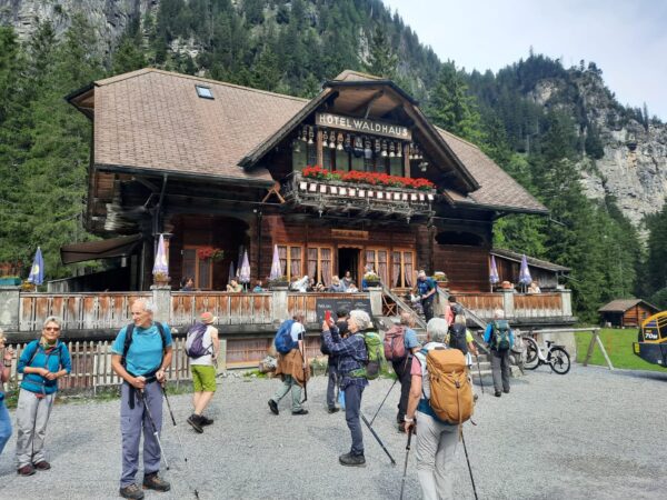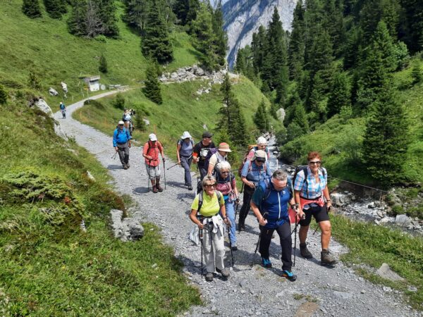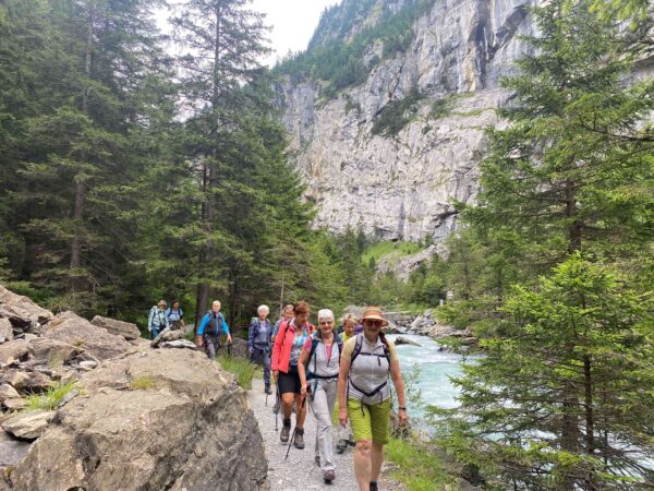 Ein gut gefüllter Autobus bringt uns vom Bahnhof in Kandersteg nach Eggeschwand. Die meisten Passagiere wenden sich direkt der Seilbahn zu, während wir uns marschbereit machen. Wir steigen der Kander entlang ins Gasteretal auf. Der Bergbach führt viel Wasser. Entsprechend ist die Geräuschkulisse. Aus der Schlucht heraustretend, wird es sofort ruhiger. Gemütlich wandern wir dem Hotel Waldhaus entgegen, wo wir bald unseren Startkaffee und die hausgemachten Nussgipfel geniessen können.