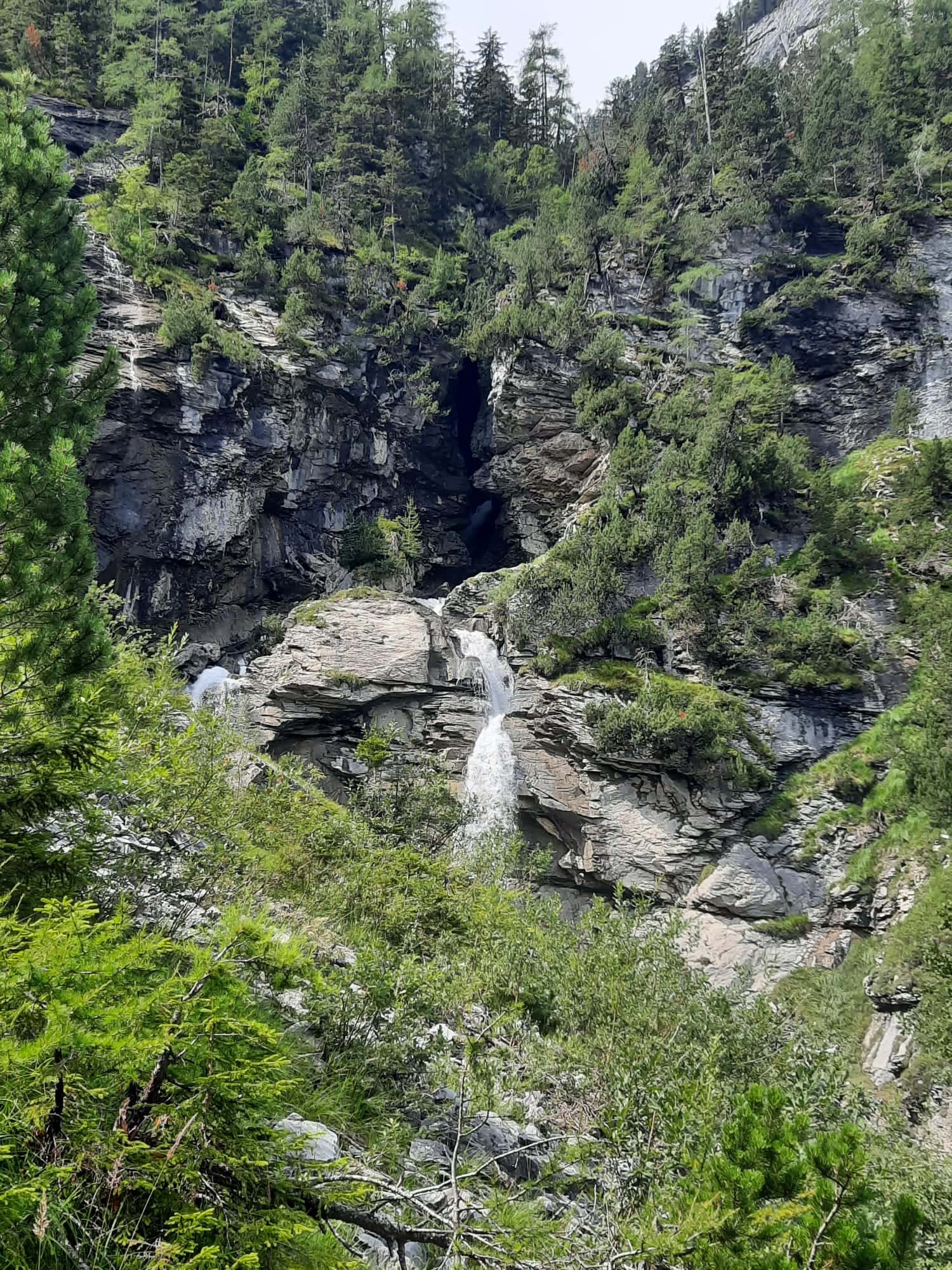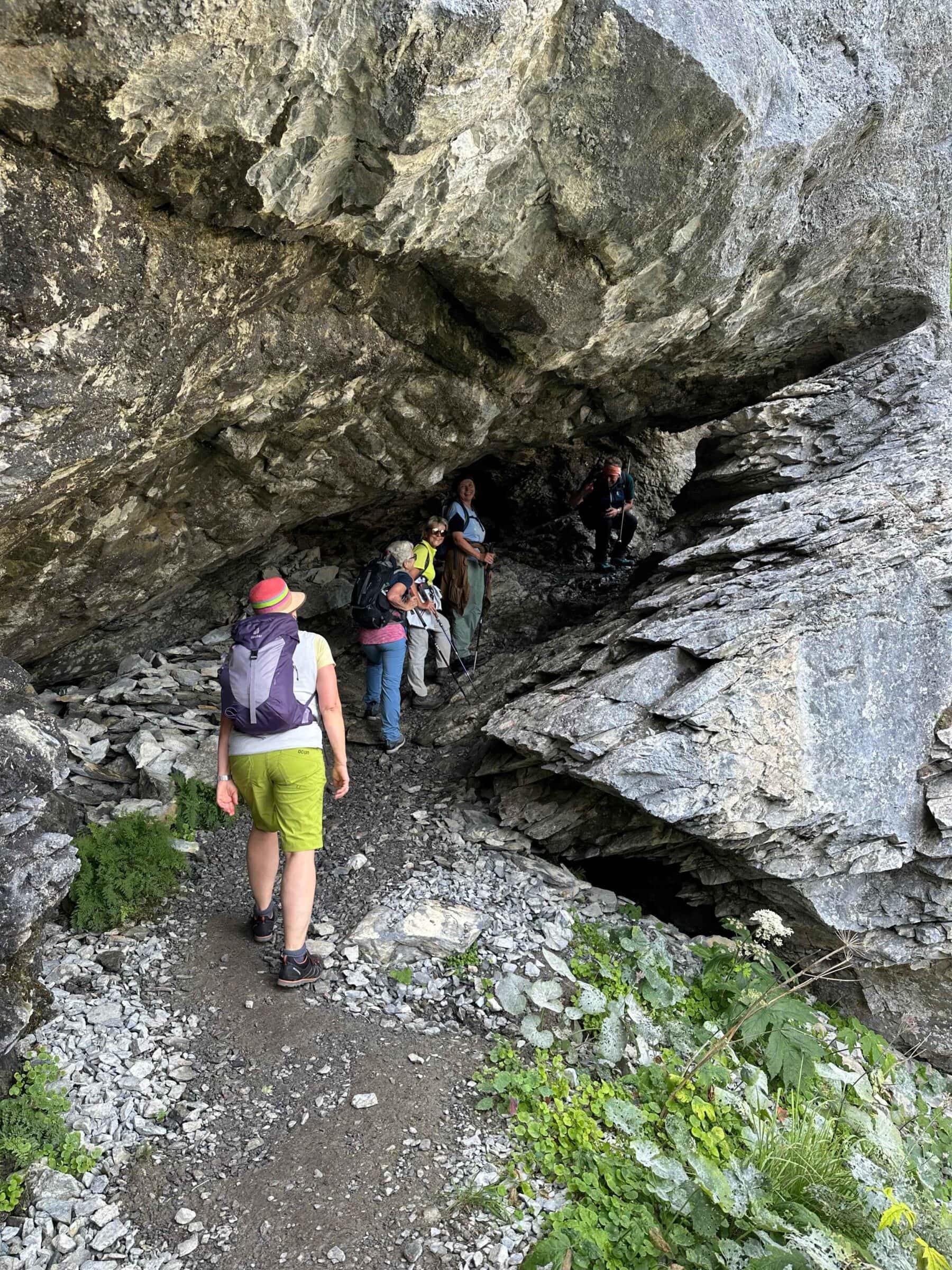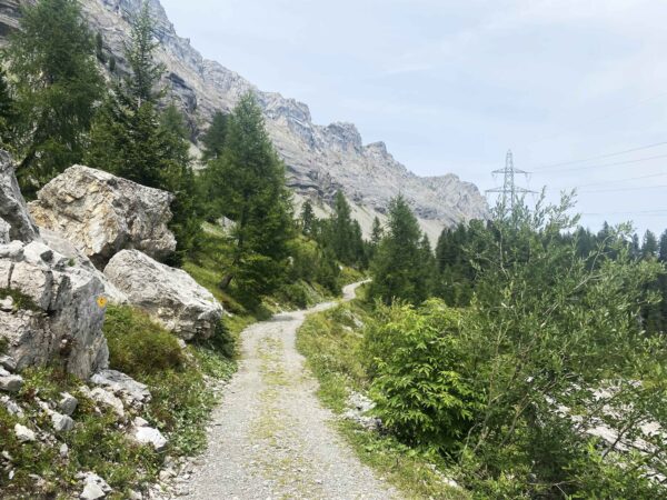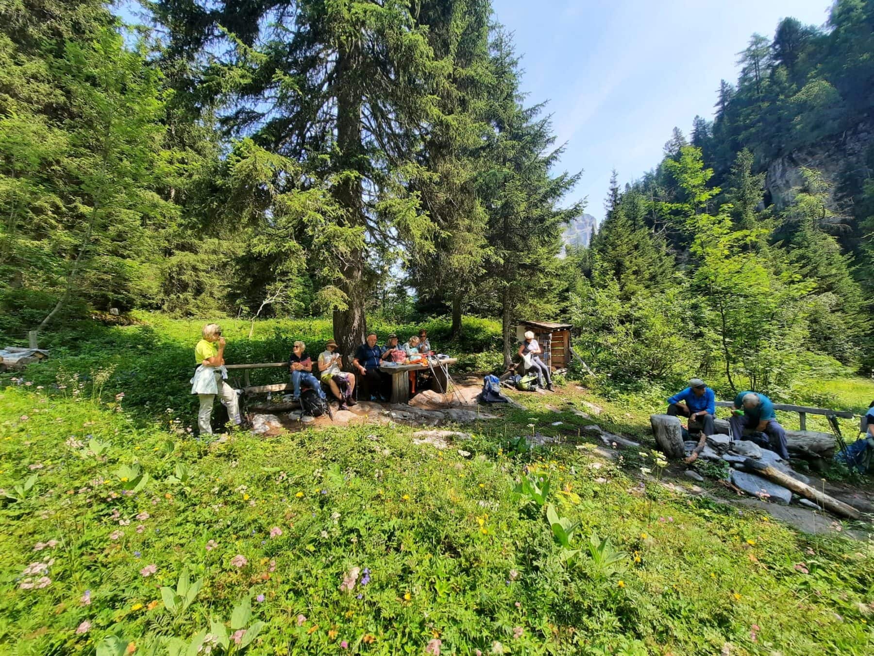 Vom Hotel Waldhaus aus wenden wir uns südwärts. Allmählich wird das Gelände steiler. Nicht so der Wanderweg! In angenehmer Steigung reiht sich Kehre an Kehre. Im unteren Teil führt er durch recht offenes Gebiet, weiter oben traversiert man zu einem Bergwald hinüber. In diesem aufsteigend gelangen wir zu einer mit Drahtseil abgesicherten Wegpassage. Jetzt beginnt ein kurzweiliger Abschnitt. Wir erreichen einen Trichter, in dem wir steil aufsteigen. Oben geht’s um die Ecke, und man befindet sich auf einem Band, dem wir folgen können. Schliesslich führt der Weg noch durch eine kleine Höhle, hinter welcher die Fortsetzung des Bandes folgt. Nach dem Brücklein über den Schwarzbach erreichen wir einen Rastplatz. Und hier finden wir, dass wir uns jetzt die Mittagspause verdient haben.