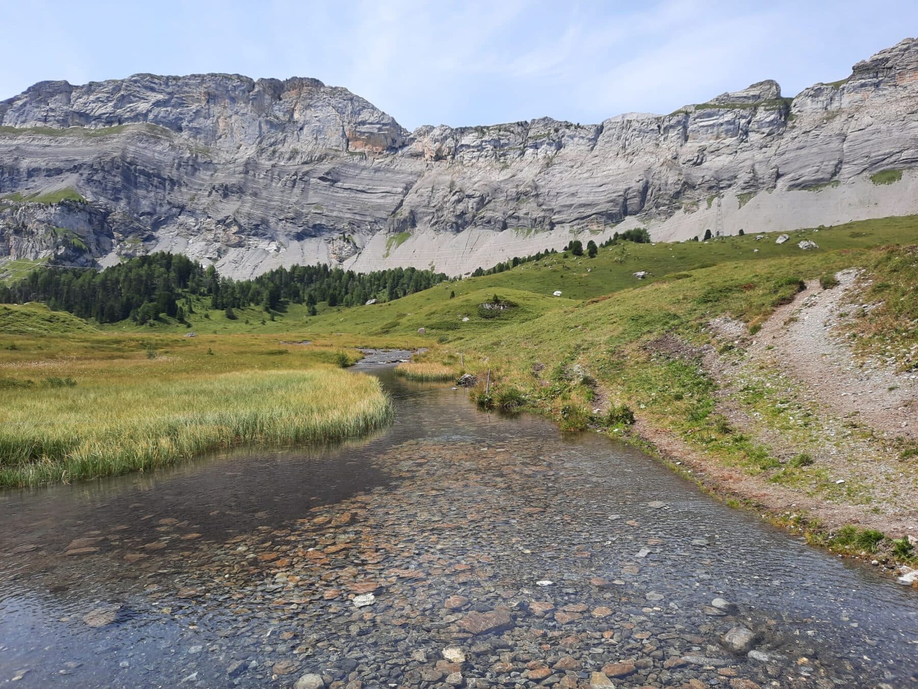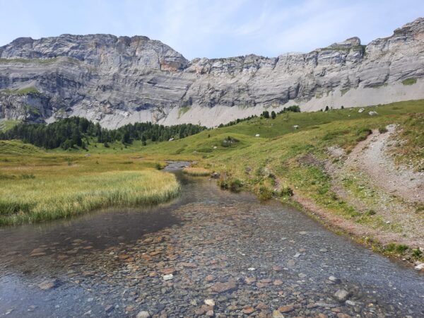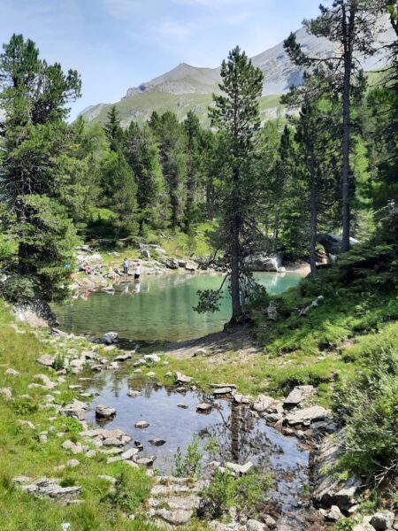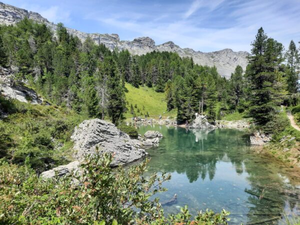 Noch haben wir die Höhe der Spittelmatte nicht erreicht. Durch waldiges Gebiet steigen wir zum Stierebergli hinauf und erreichen ein Bergsträsschen. Dieses führt uns schliesslich zur Spittelmatte und zum Gemmipassweg, dem wir folgen, bis wir zum Arvenseeli abzweigen können. Beim zweiten der drei Seen gibt’s jetzt die «Dessertpause», und einige nutzen die Gelegenheit, um im klaren Wasser die Füsse abzukühlen. Nach ausgiebiger Pause wandern wir am Fuss des Üschenengrats entlang nach Sunnbüel, wo die Wanderung ihren Abschluss findet, und die Rückreise individuell angetreten werden kann.