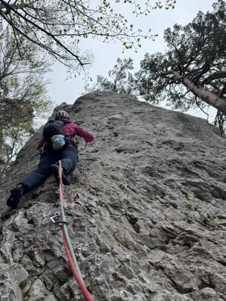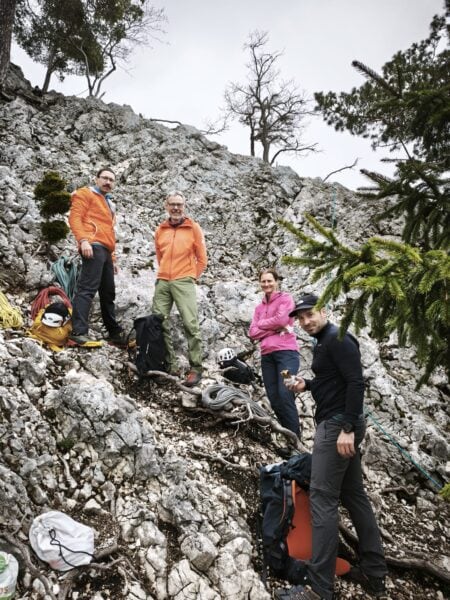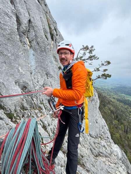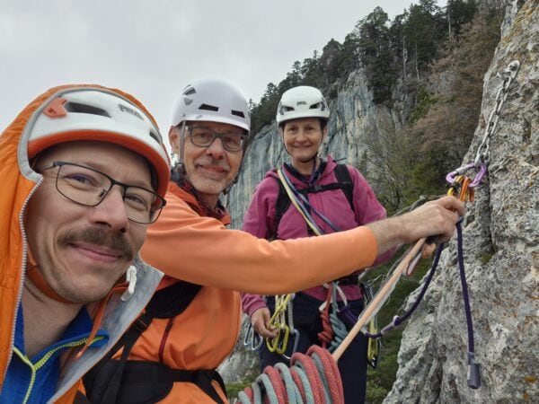 Für den Aufstieg formierten wir uns in zwei Seilschaften – eine 2er- und eine 3er-Seilschaft. Schon nach den ersten Metern war klar, dass der Eulengrat seinem Ruf gerecht wird: abwechslungsreiche Kletterei, immer wieder luftig, aber gut abgesichert und mit einem schönen Rhythmus. Wir waren dabei praktisch immer direkt hintereinander unterwegs, was der Tour eine besonders gemeinschaftliche Dynamik gab. An den doppelt eingerichteten Ständen bot sich so immer wieder die Gelegenheit für kurze Pausen, kleine Gespräche und das eine oder andere gemeinsame Lachen.