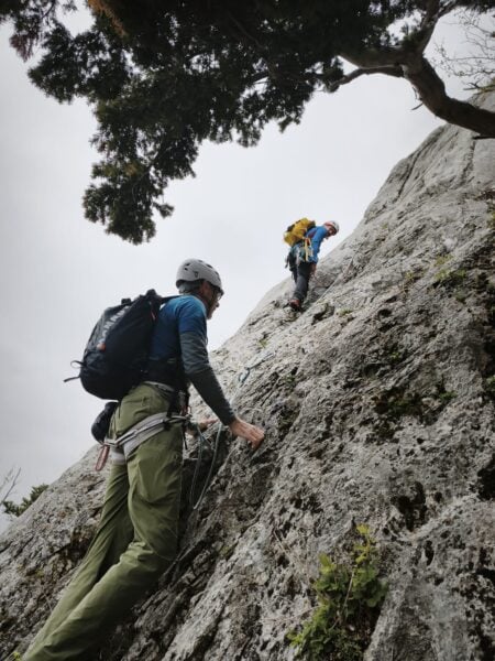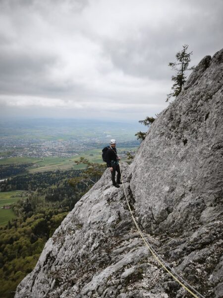 Auch wenn die Aussicht an diesem Tag hinter den Wolken verborgen blieb, hatte die Tour ihren ganz eigenen Reiz. Der Fokus lag stärker auf der Kletterei selbst, auf den Bewegungen im Fels und dem Miteinander in der Seilschaft. Gerade die kompakteren Passagen sorgten immer wieder für Konzentration, während leichtere Stellen Raum für Gespräche liessen.