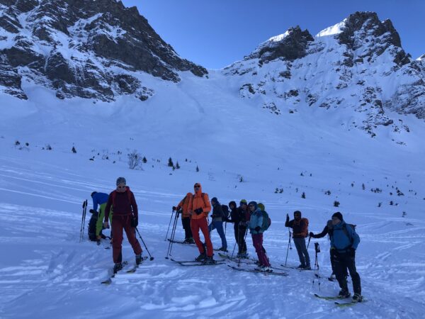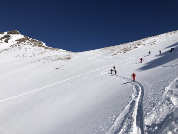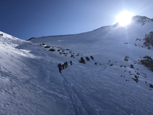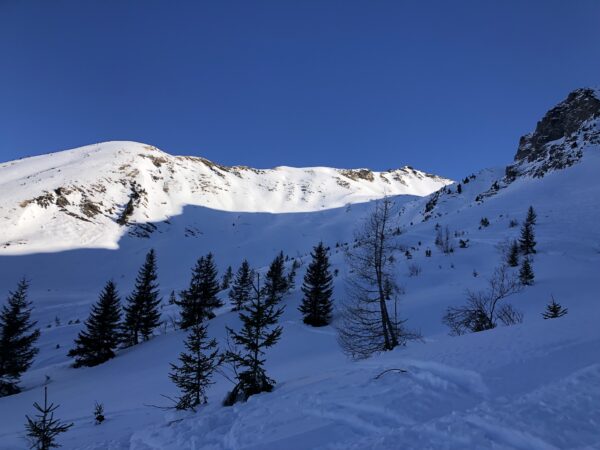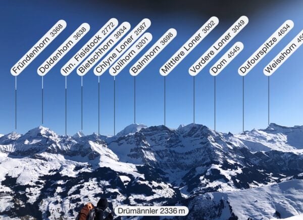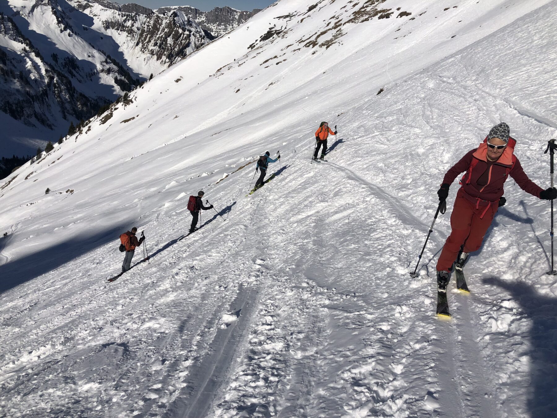 Frühmorgens staunten wir über das bereits grosse Verkehrsaufkommen auf der Autobahn Richtung Bern. Nach Bern lichtete sich neben dem Verkehr auch der Nebel. Die Sicht auf die Berner Alpen in der Morgendämmerung weckte Vorfreude auf einen schönen Tourentag. Um 9.00 liefen wir im vorderen Fildrich (Diemtigtal) los, schattig, kalt, die uns umgebenden Gipfel im Sonnenschein. Die erste Stunde gings sanft ansteigend das Tal hinauf. Die anschliessende Steilstufe war ohne Harscheisen machbar. Im oberen Talkessel empfing uns die warme Sonne. Weiter gings aufs Bodezehore, wo uns eine grossartige Aussicht erwartete. Wir genossen eine erste Abfahrt in schwerem Pulver in den oberen Talkessel zurück. Die Unermüdlichen stiegen dann zum Drümännler auf und wurde erneut mit grossartiger Aussicht belohnt. Beim Gipfelaufstieg zu Fuss beeindruckte die mächtige Wächte. Es folgte eine tolle Abfahrt, der Gipfelhang mit schwerem Pulver, die weiteren Sonnenhänge mit tiefem, aber gut fahrbaren Sulz. Im schattigen Talgrund fand sich neben den vielen Spuren zwischendurch noch etwas Pulver.