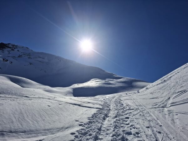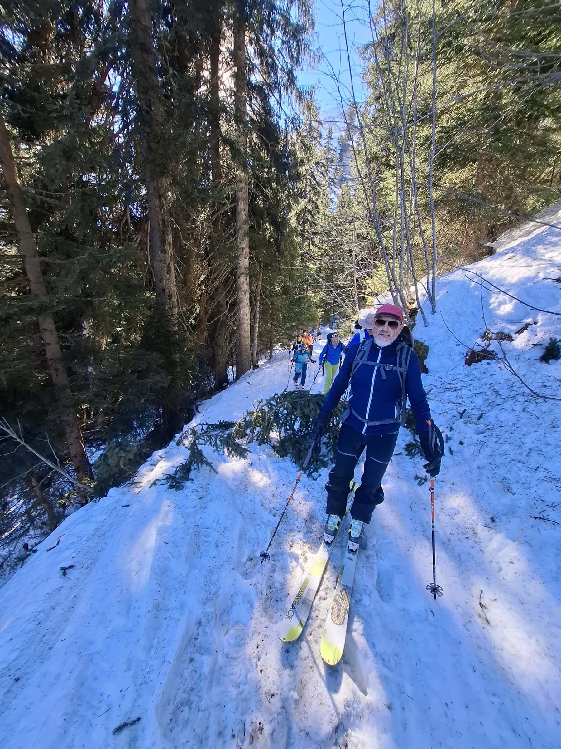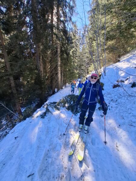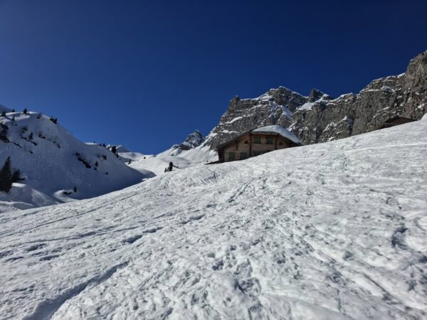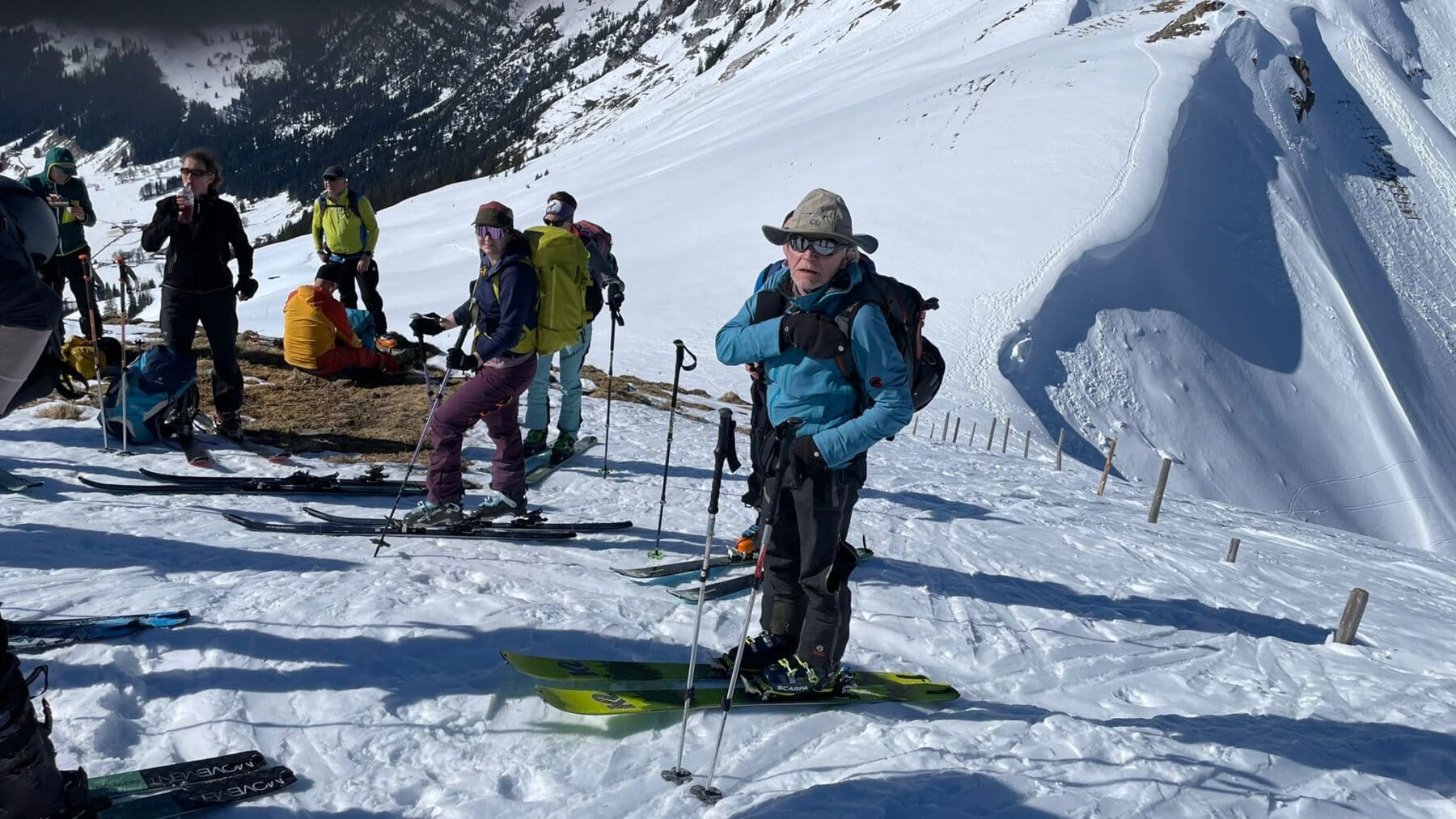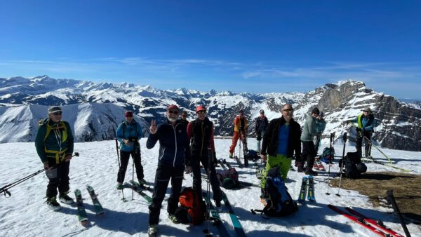Endlich wieder eine Mittwochskitour. Nach über einer Woche starken Schneefall, ist es heute sonnig, sehr warm und das Frühlingsgefühl ist im Anmarsch. Durch die angespannte Lawinensituation wurde das Tourenziel vom Bisisthal ins Diemtiegtal verlegt. Start auf der Grimmialp bei 1 Grad, mit weniger Schnee als erwartet. Nach dem Motto bei jeder grossen Alp gibt es eine Pause und eine Kleiderschicht wird abgezogen, erreichten wir den Gipfel. Der erste Teil durch den Wald, war geprägt vom vielen Löchern auf der Spur durch die Schneeschuhtüreler. Die sonnige Frühlingswärme spürten wir ab der Alp Grimmi. Auch die letzten Teilnehmer cremten sich eine grosszügige Schicht Sonnencreme ins Gesicht und/ oder Kopf. Andre montierten ihren Sonnenhut. Sonne, blauer Himmel, Sicht auf die weisse Pracht und den Gipfel im Visier verleiht automatisch viel Energie und Entspannung. Der Aufstieg nach der Alp Grimmi und Gipfelhand waren wie erwartet, fest verfahren. Die Schneequalität erreicht nicht die höchsten Bewertungspunkte, jedoch übertrifft es unsere Erwartung, dass wir keine Schneestollen unter den Fellen kleben hatten.