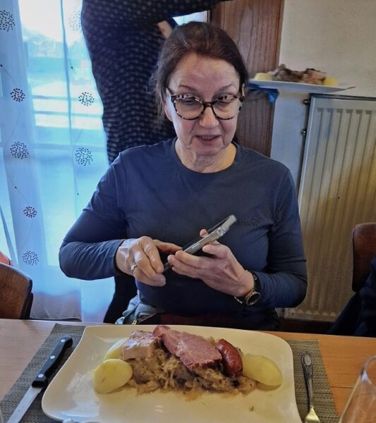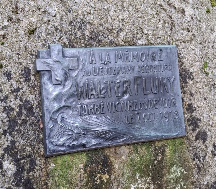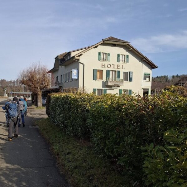 Beim Mittagessen holte uns eine SAC-Gastwanderin ein, welche die Ankunft in Porrentruy um 30′ verpasst hatte. Nach dem Mittagessen im Hotel-Restaurant de la Gare genossen wir die Stille um den Etang de Vendlincourt. Nach einem kurzen Abstecher ins Elsass (eine Abzweigung verpasst) und über einen Schmugglerpfad zurück in den Jura, marschierten wir weiter Richtung Charmoille. Ein kurzer Umweg führte uns zum Monument Flury. Leutnant Walter Flury aus Grenchen wurde am 7. Okt. 1918 in seinem Fesselballon in 600m Höhe von zwei deutschen Jagdfliegern tödlich abgeschossen. Pünktlich um h15.21 erreichte die Spitze der Gruppe Charmoille, wo gerade der Bus Richtung Courgenay eintraf. Glücklicherweise hatte der Busfahrer Geduld mit uns, und wir schafften es alle in den Bus. Die Tour endete vor dem geschichtsträchtigen Hotel-Restaurant de la Gare «La Petite Gilberte», wer kennte es nicht dieses Lied: