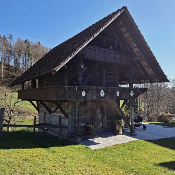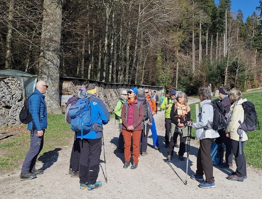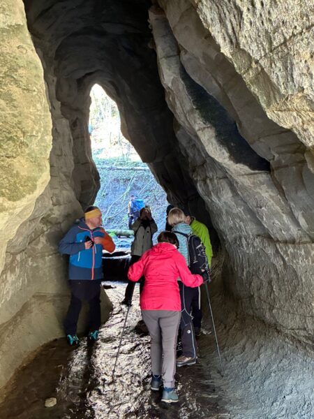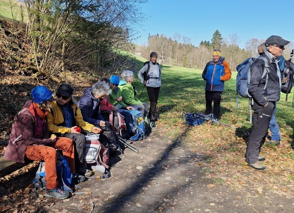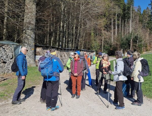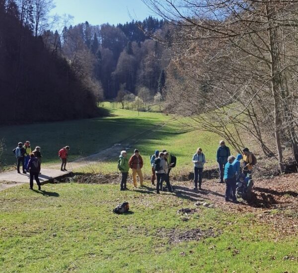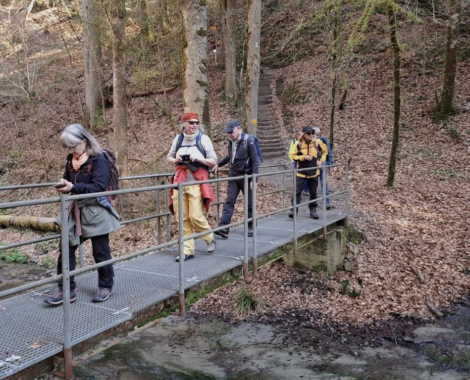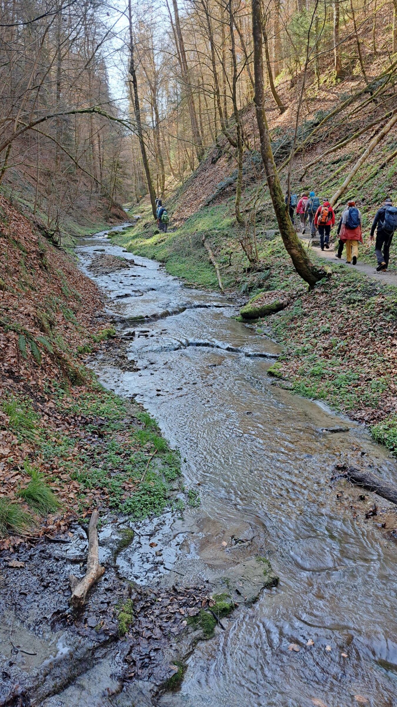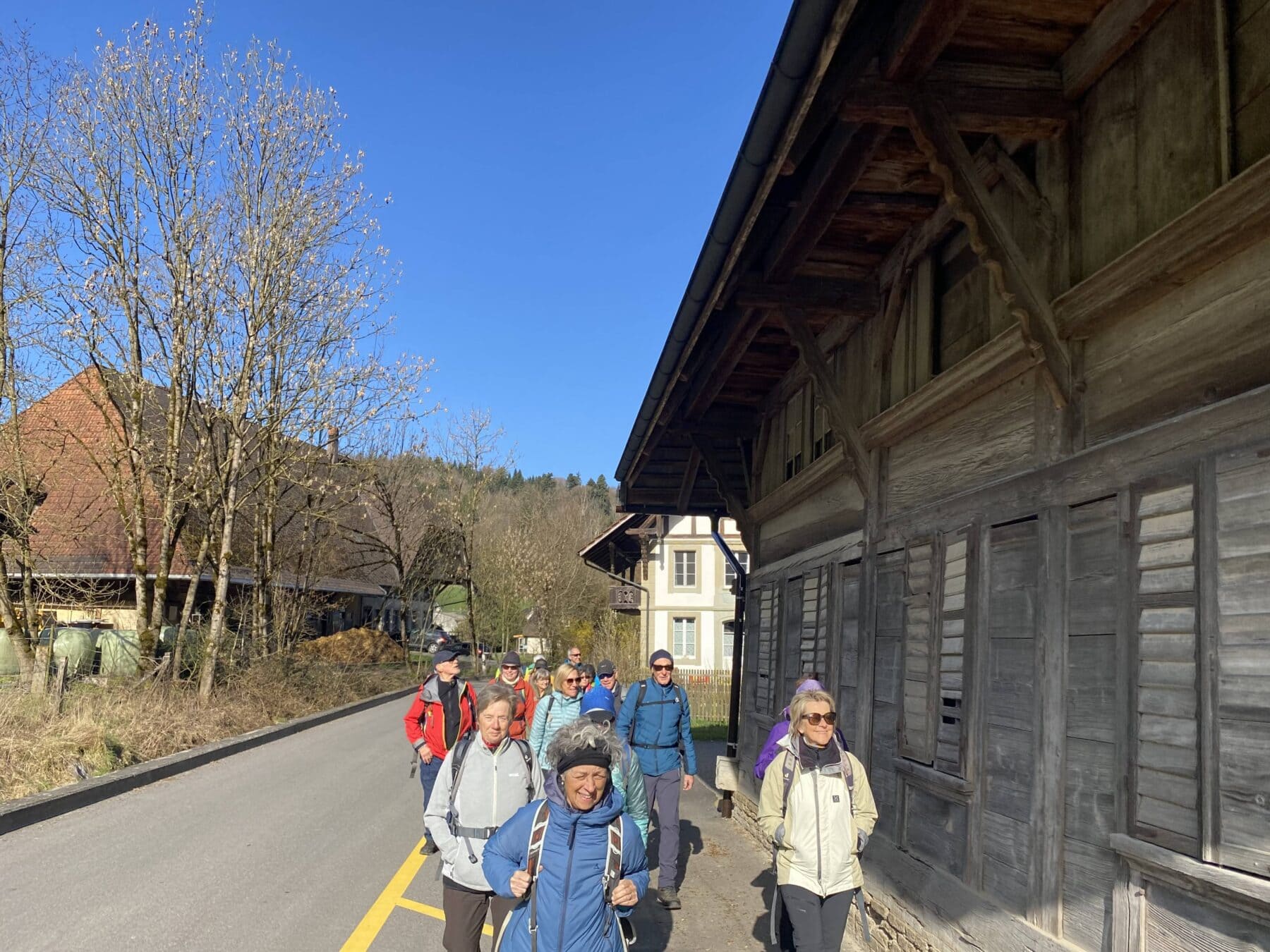 Nach der Busfahrt durch malerische Bauerndörfer stehen wir in Riedtwil zum Abmarsch bereit. Auch hier erfreuen uns wieder etliche wunderschöne Berner Bauernhäuser. Gemütlich geht’s ins Tal des Mutzbachs hinein. Eine erste kurze Rast machen wir bei einem Bänklein, hinter welchem sich ein Bach-Tunnel versteckt, den wir natürlich inspizieren müssen. Ebenso den Biberbau etwas weiter oben am Mutzbach.