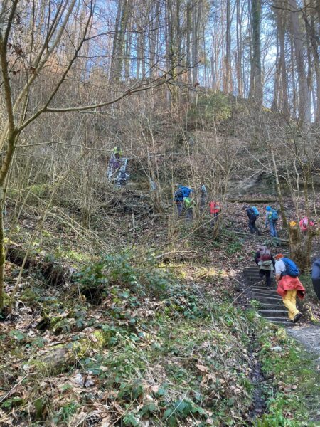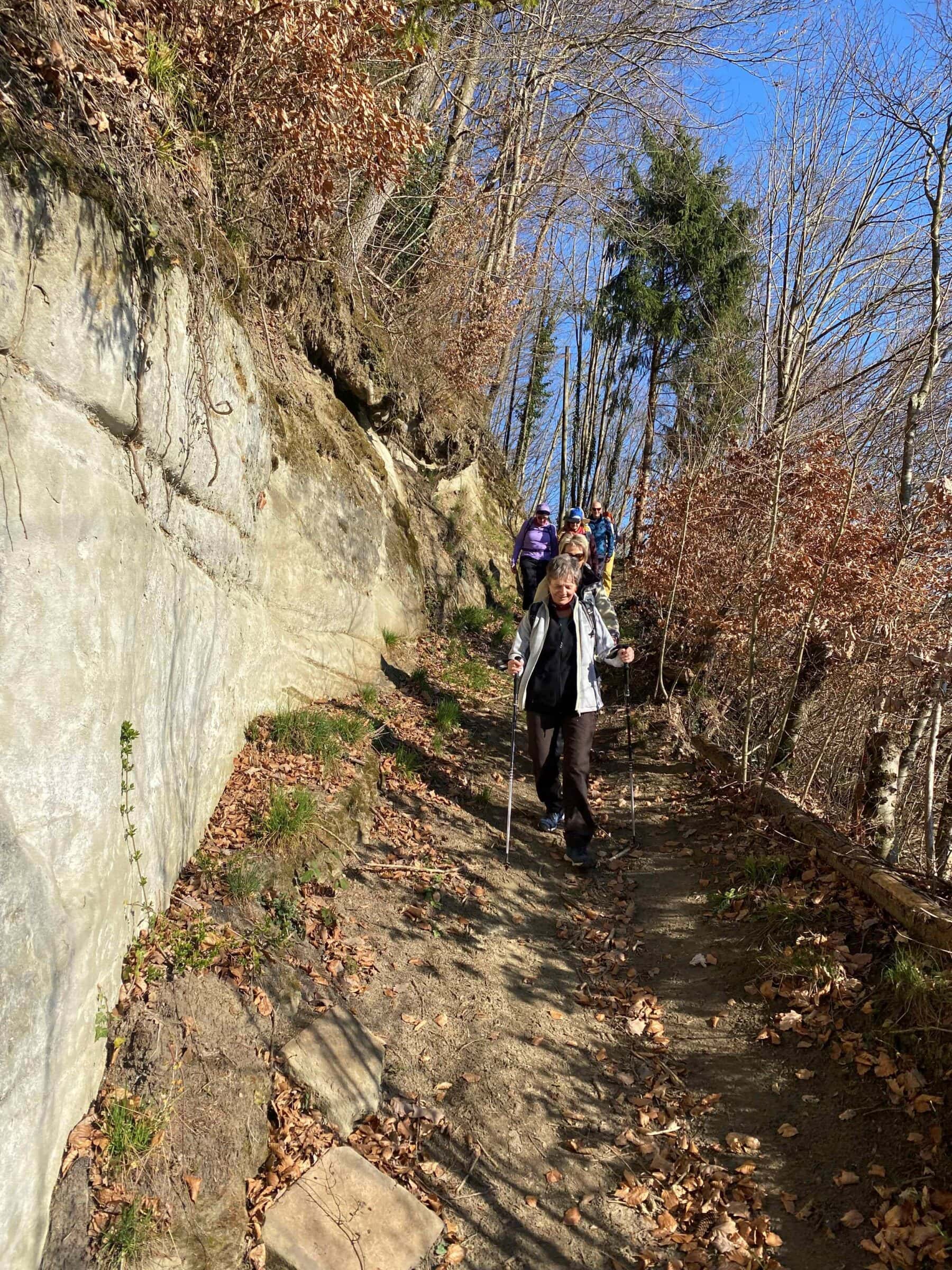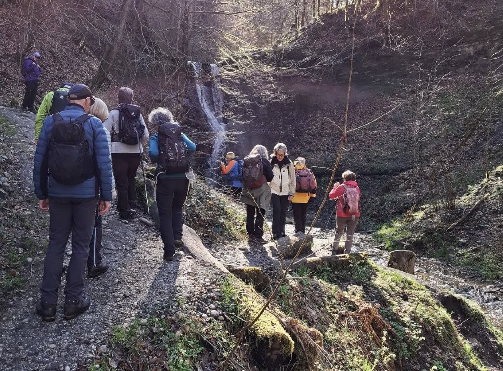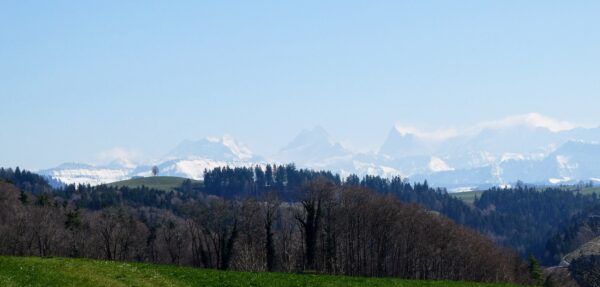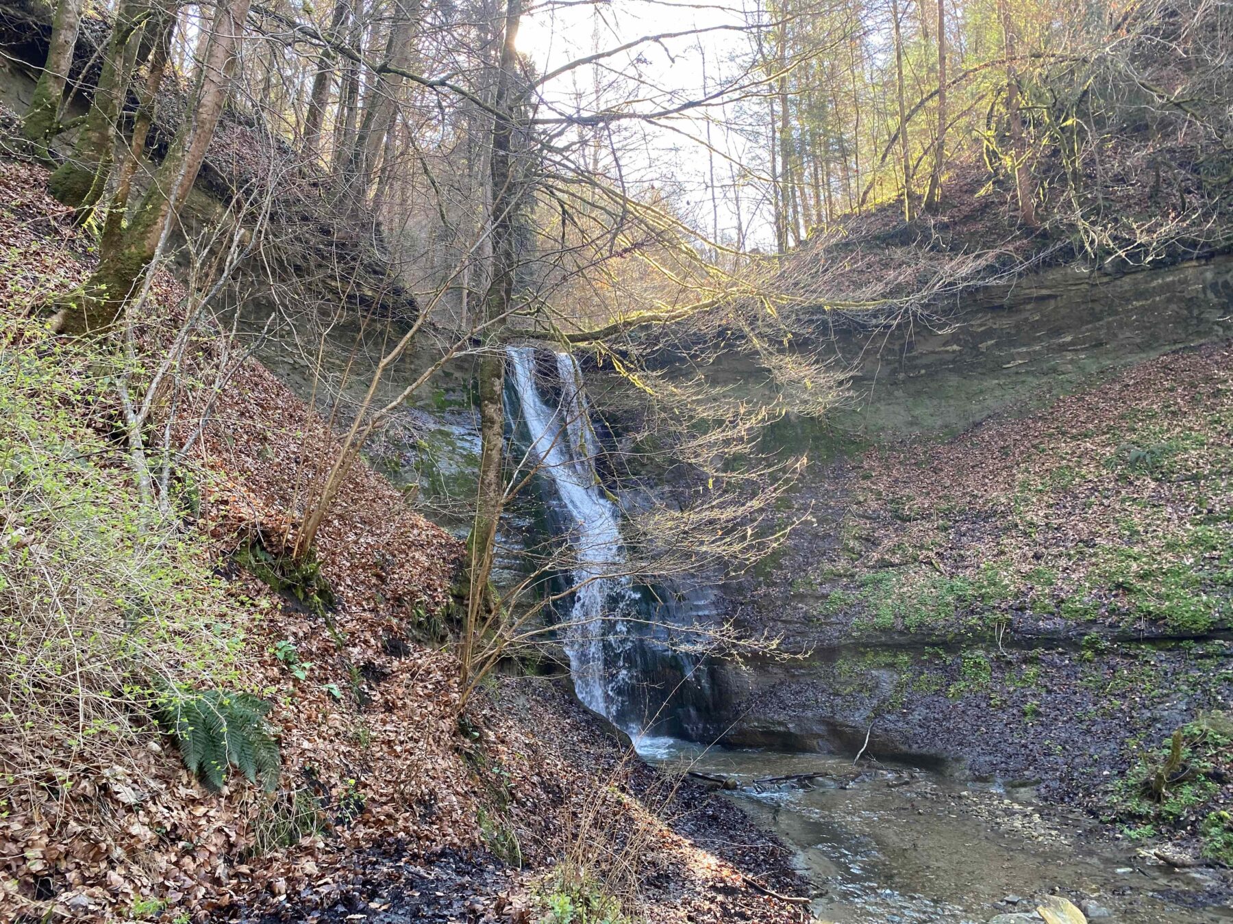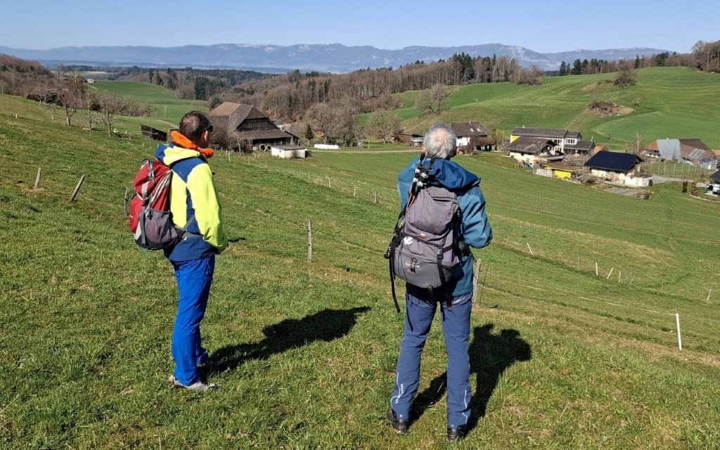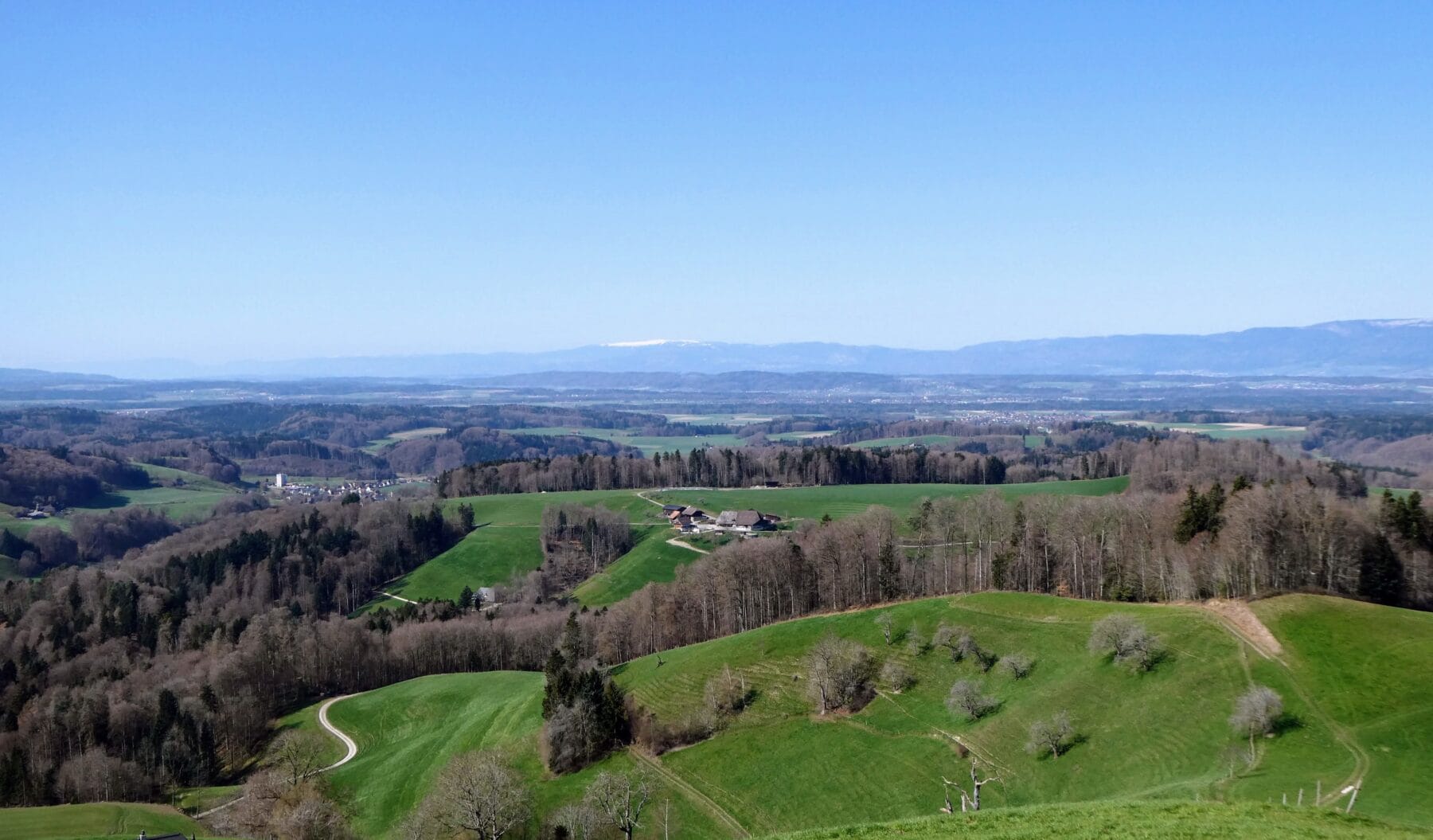 Weiter dem Bach folgend gelangen wir in den Wald und zum Mutzbachfall. Eine Eisentreppe ermöglicht den Zugang zum oberen Bachlauf. Nach kurzer Zeit verlässt der Wanderweg den Mutzgraben und führt steile sechzig Höhenmeter hinauf auf eine Forststrasse. Nun geht’s gemütlich weiter nach Rüedisbach, zuerst noch im Wald, dann über offene Wiesen. Bei kleineren Bauernhofgruppen vorbei gelangen wir zum Oberbühlknubel, welchen wir südlich umrunden und schliesslich von Osten her besteigen. Eine zünftige Bise bläst, aber auf der Westseite des Gipfelhäuschens ist es erstaunlich windstill. Der Oberbühlknubel ist ein erstklassiger Aussichtspunkt, sowohl gegen den Jura hin als auch gegen die Alpen.