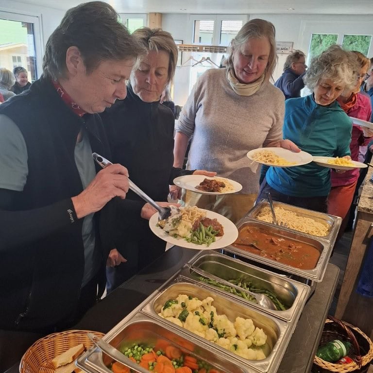 Ein kurzer Abstieg bringt uns zum Weiler Ferrenberg hinunter. Im Nachbarhaus des altehrwürdigen, leider geschlossenen Restaurants «Zum Wilden Mann», kehren wir in der «Hofchuchi» von Susanne Friedli ein. Wir erfahren einiges über ihre Küche, über das Leben hier oben, über die Wynigenberge. Und schliesslich geniessen wir das ausgezeichnete Mittagsmenu mit Rindsgeschnetzeltem, hausgemachten Nudeln, Pommes Frites und dreierlei Gemüse. Erst um die halb drei Uhr machen wir uns auf den Rückweg.