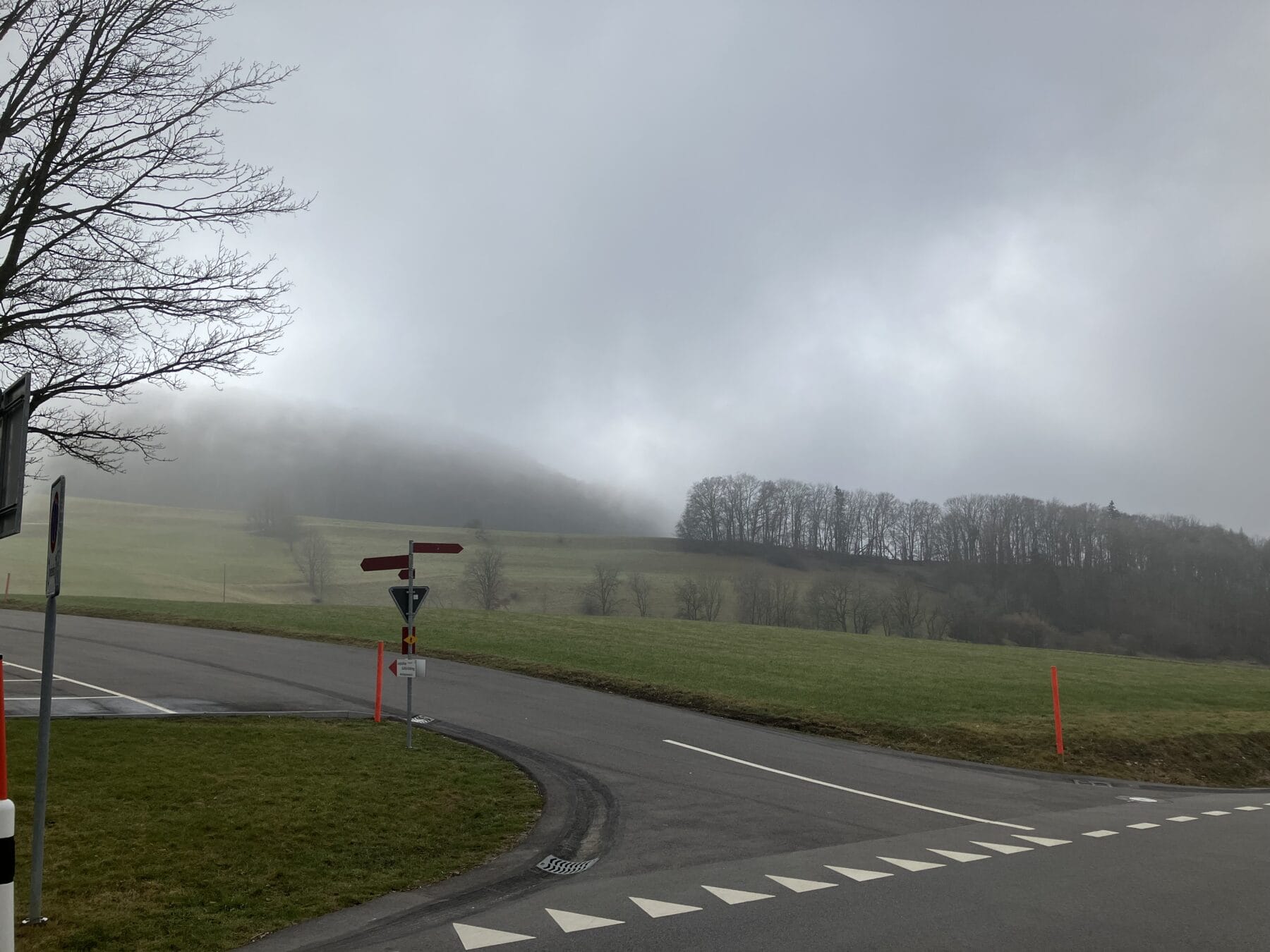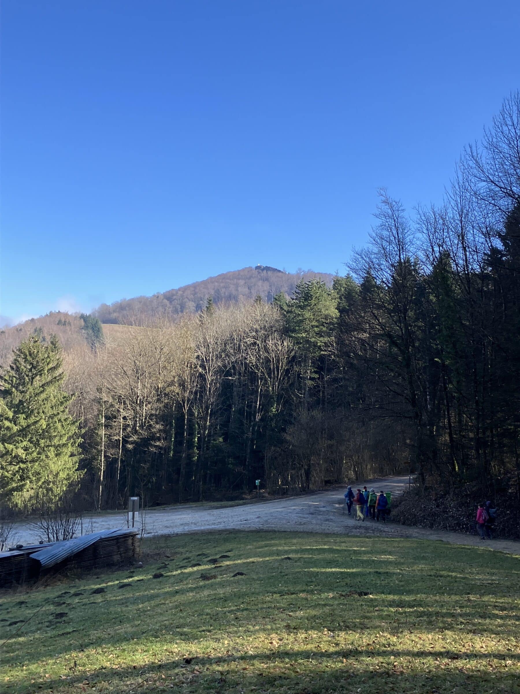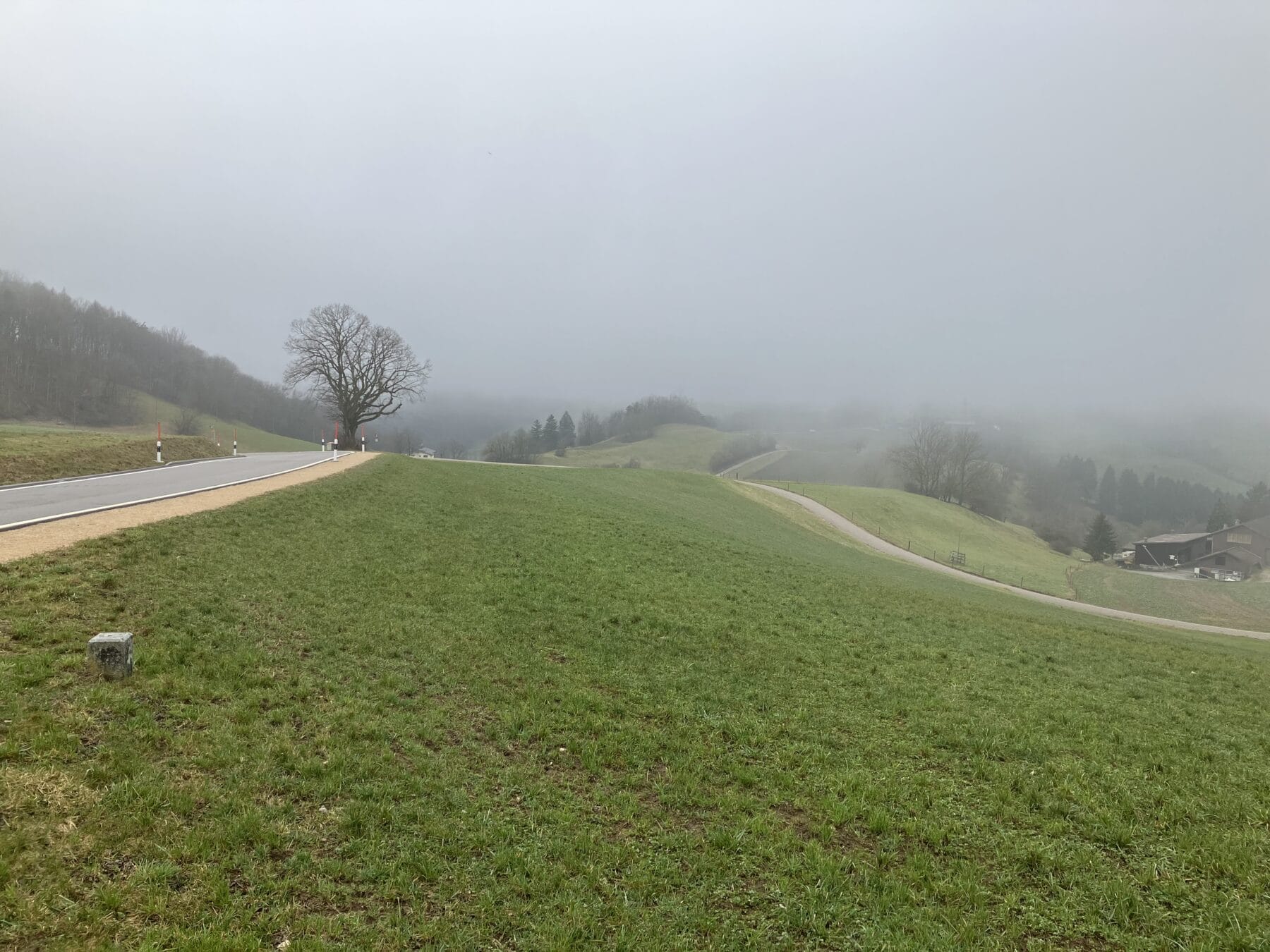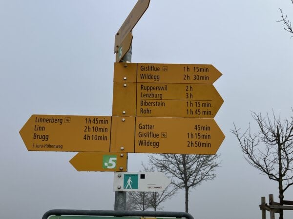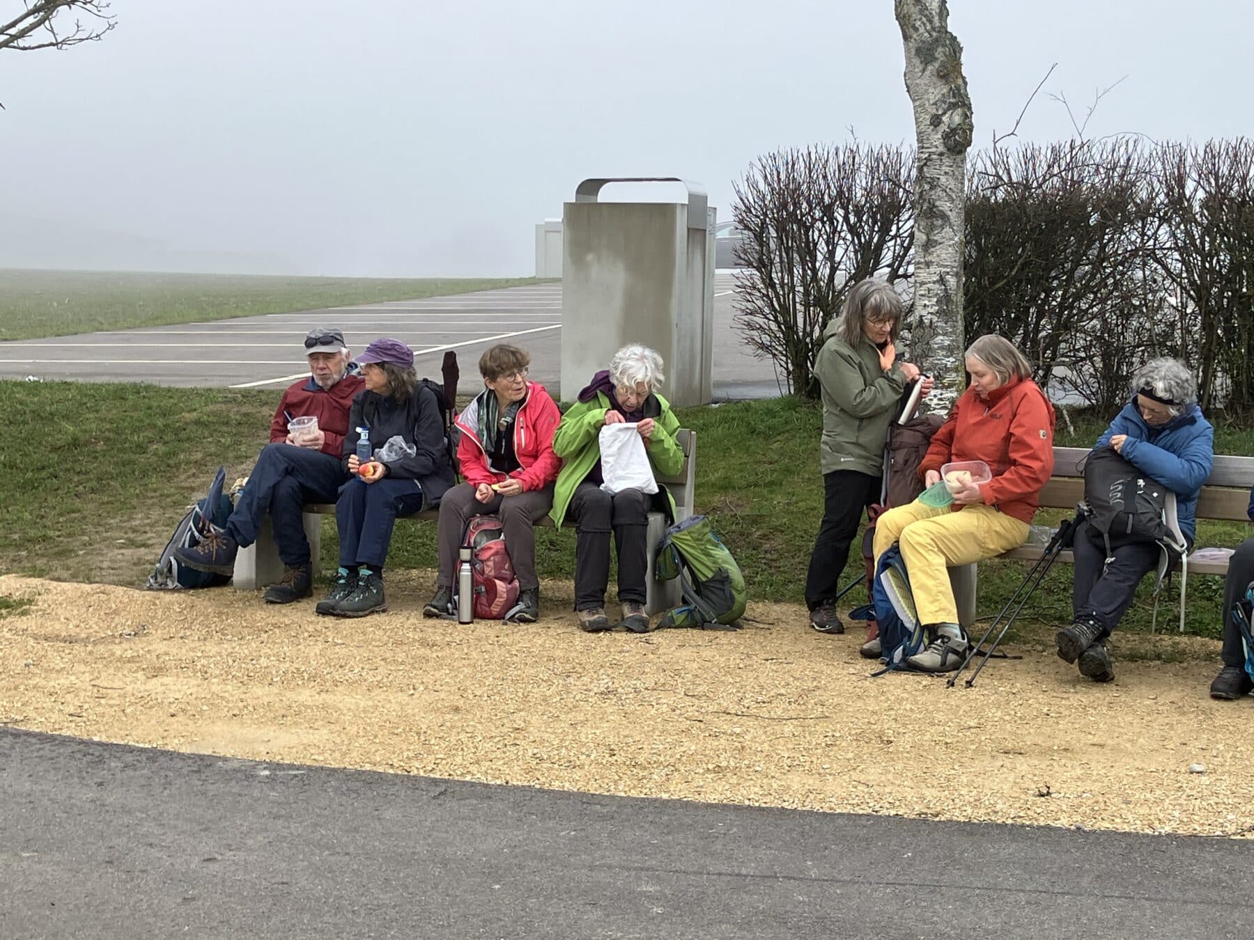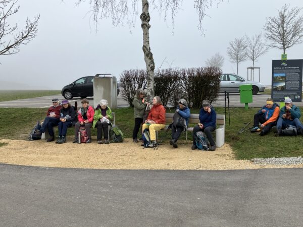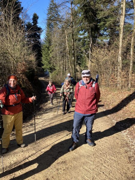 Angekommen mit dem Bus auf der Salhöhe standen wir im Nebel. Munteren Schrittes gingen wir bergan auf den Grat, Uf der Egg , in der Hoffnung, dass sich bald die Sonne zeigen würde. Aber dem war nicht so. Es triefte von den Bäumen, und man sah kaum 50m weit. Bevor wir zum Benkerjoch (669m) hinunterstiegen, gab es noch einen Trinkhalt. Weiter ging es Richtung Staffelegg. Wir überquerten die Passstrasse und und stiegen zum Punkt 659m auf. Auf den zwei Bänken beim Parkplatz nahmen wir unser Picknick ein. Etwas ausgekühlt machten wir uns wieder auf den Weg entlang dem Hügelzug Egg und dann hinauf zum Gatter, Pkt. 642, wo wir endlich in der Sonne standen. Nach einer Ruhepause folgte der Abstieg nach Biberstein. Bei der Haltestelle kam gerade der Bus nach Aarau herangefahren. Wir stiegen alle ein und beim Bahnhof Aarau sind wir noch zu einem Umtrunk eingekehrt.