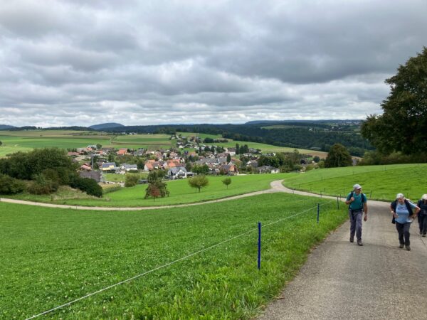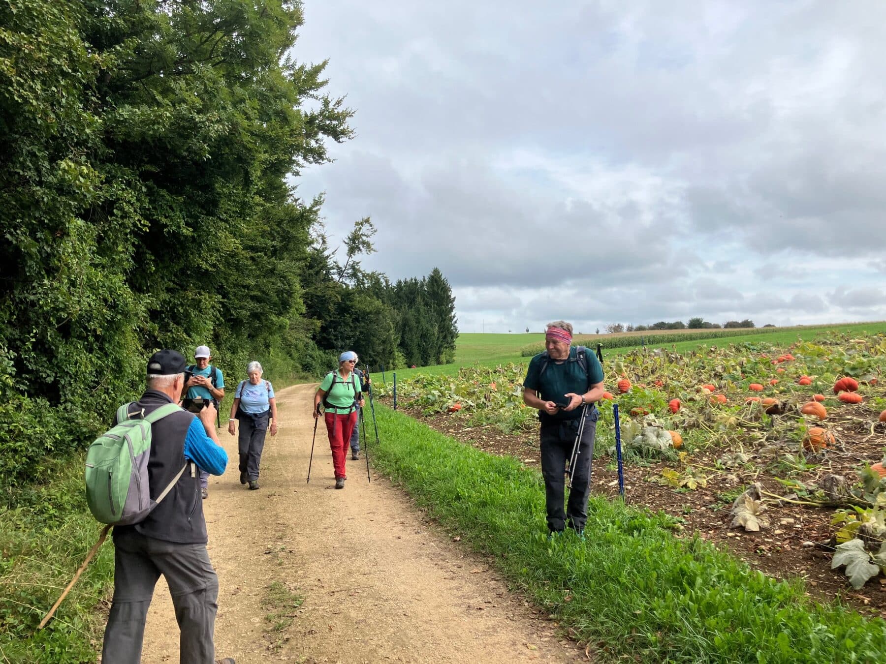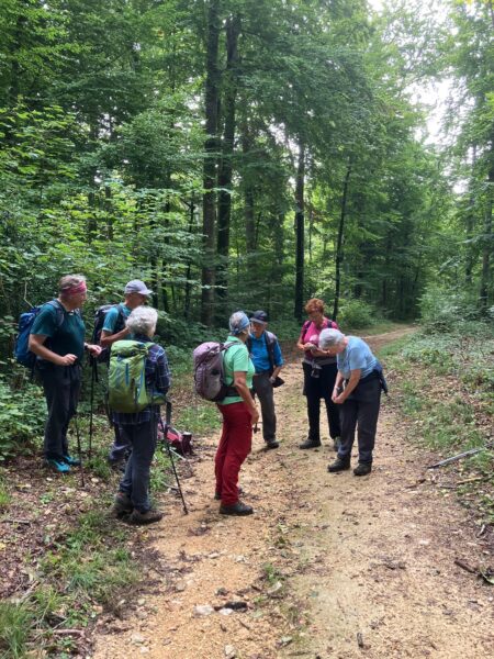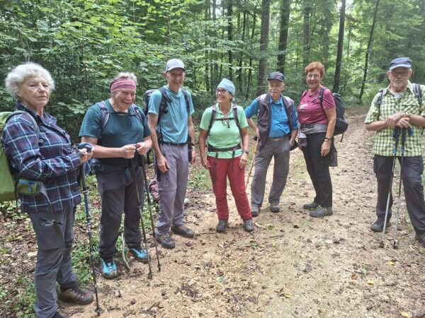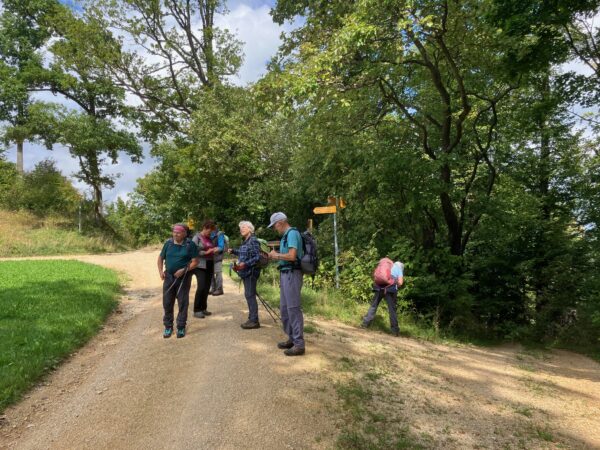 Der Wettervorhersage entsprechend bestiegen wenige Wanderer den steilen Serpentinenweg zum Blittechopf, ja gezeichnet von der Waschküchentemperatur gab es den ersten Trinkhalt. Über die Hochebene ging es vorbei an diversen Gehöften und Feldwegen, nur begleitet von Raubvögeln die auf den abgeernteten Feldern nach essbarem suchten.
