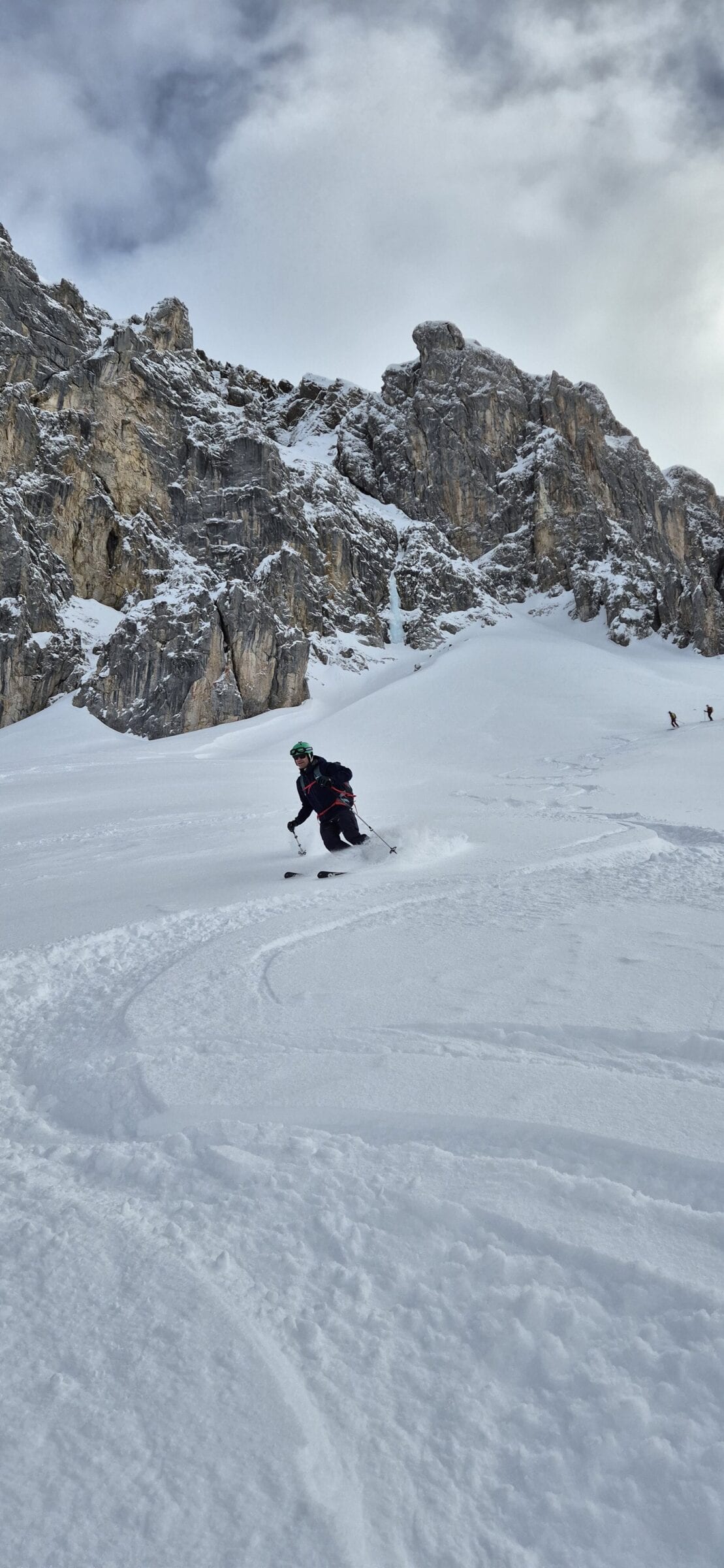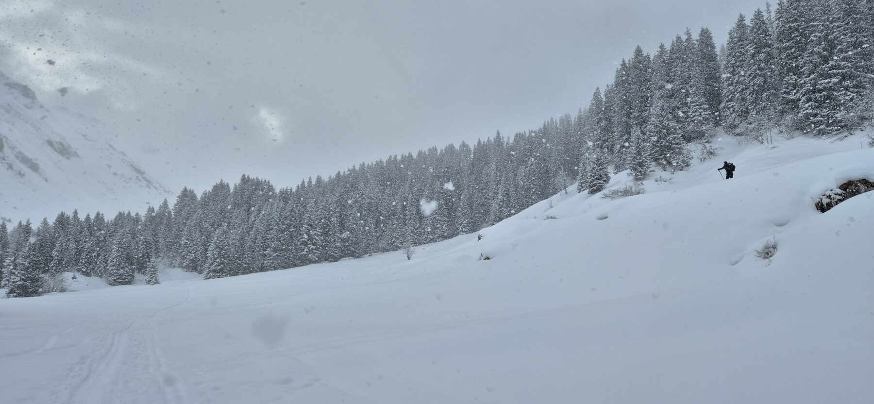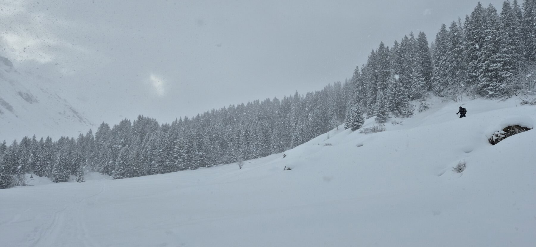 Am ersten Tag starteten wir vom Parkplatz Rüti unsere Skitour in Richtung Spitzenbüehl. Leichter Schneefall begleitete uns beim Aufstieg durchzogen von kurzen Aufhellungen, die die winterliche Landschaft in ein stimmungsvolles Licht tauchten. Die Gespräche waren lebhaft, und trotz der angepassten Ziele war die Motivation hoch. Dank dem Gespür von Oli führte er uns eine Abfahrt zum Grosslaub, ein Volltreffer! Nach dem Genuss folgte ein Wiederaufstieg in den Boller.