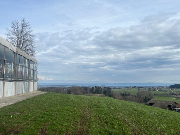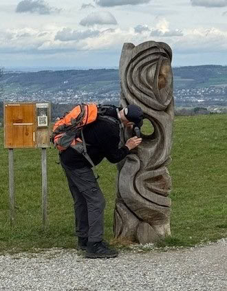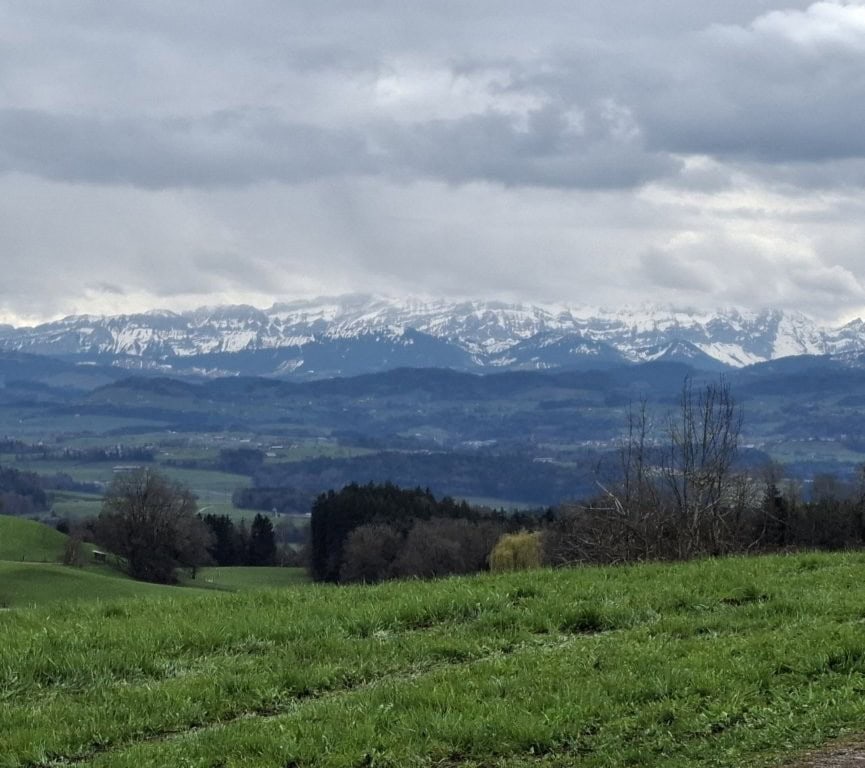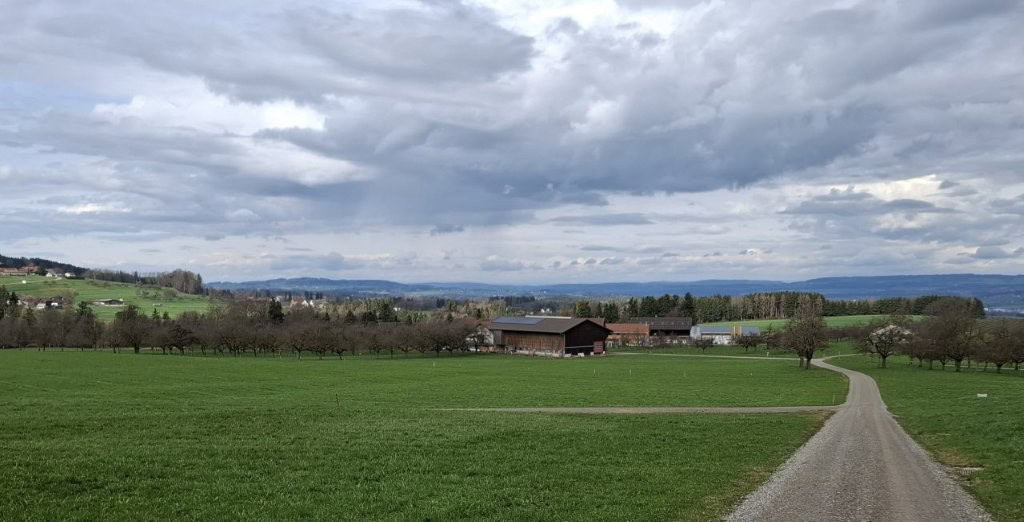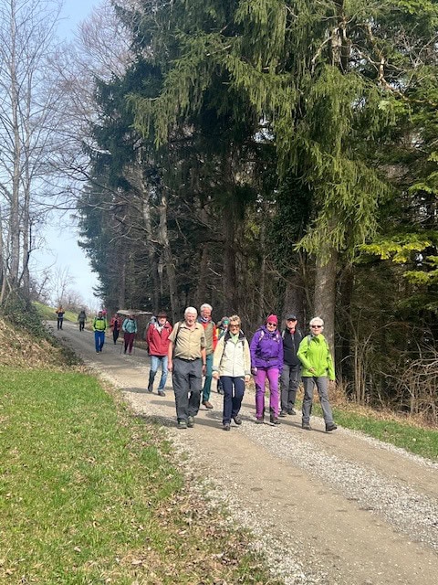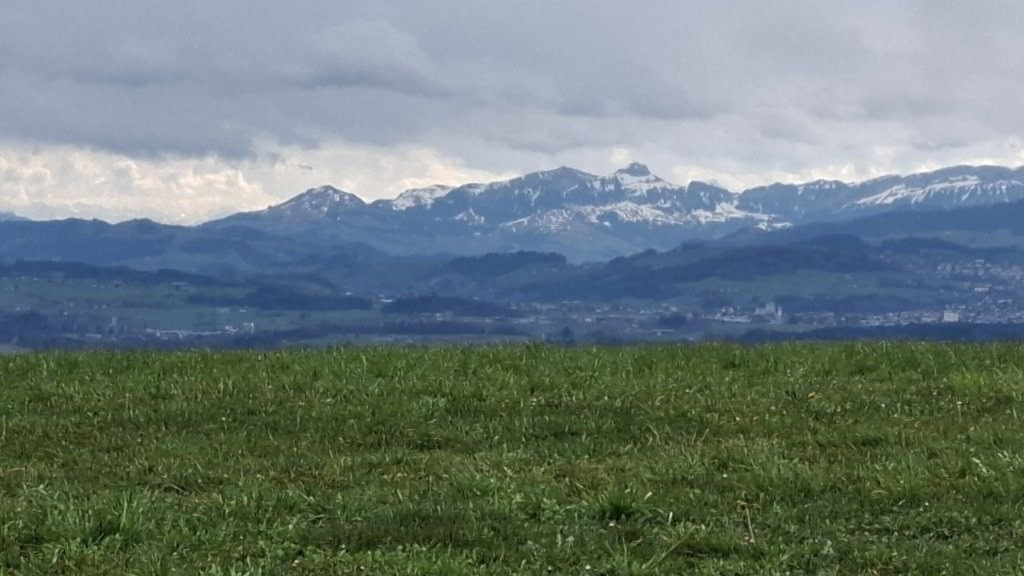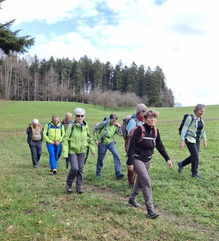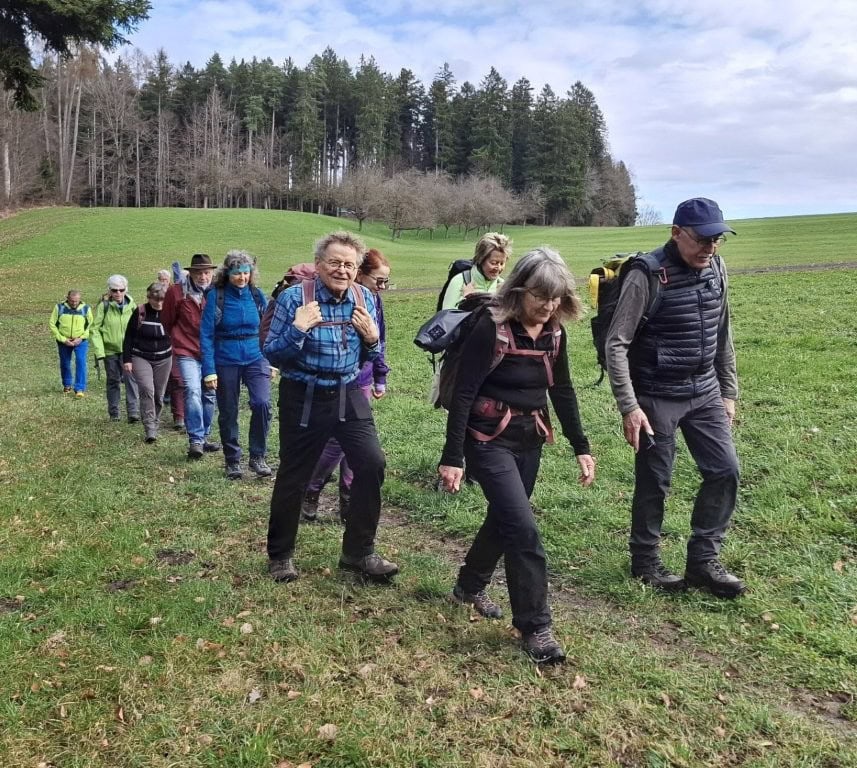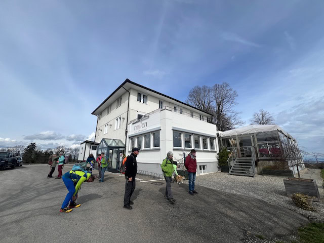 Die Wanderung am Vormittag führt uns von Schönholzerswilen bei Weinfelden über Wiesen und Wälder auf den Aussichtspunkt Nollen. Das ist nicht die Originalroute des Thurgauer Panoramaweges. Bei der Rekognoszierung der Route von Bischofszell auf den Nollen hat sich gezeigt, dass längere Abschnitte über verkehrsbelastete Asphaltstrassen führen. Darum wurde die Alternativroute von Schönholzerswilen gewählt. Bei kühlem, aber ziemlich sonnigen Wetter erreichen wir das Restaurant auf dem Nollen. Die Aussicht von hier ist in alle Richtungen offen. Vom Bodensee über die Berge des Voralbergs, den Alpstein, die Churfirsten bis in die Hügel des Toggenburgs breitet sich ein einmaliges Panorama aus. Einzig der Gipfel des Säntis ist wie häufig in einer Wolkenkappe versteckt.