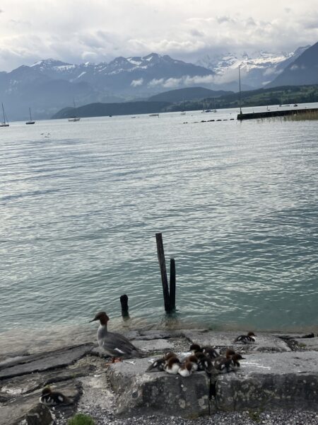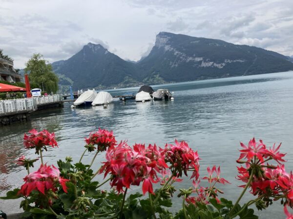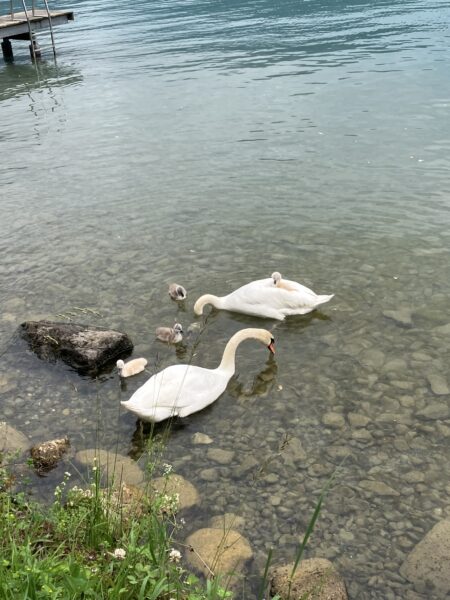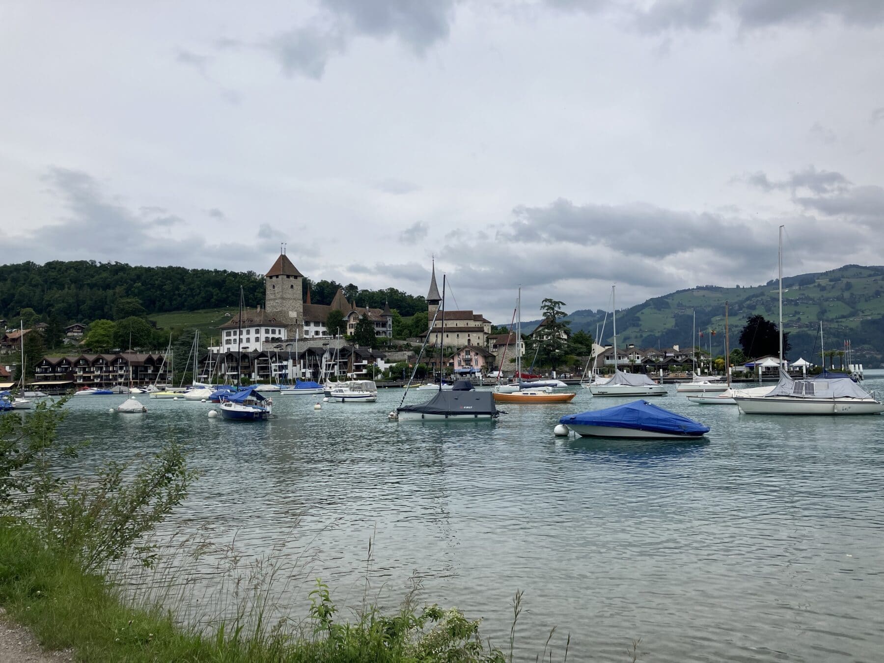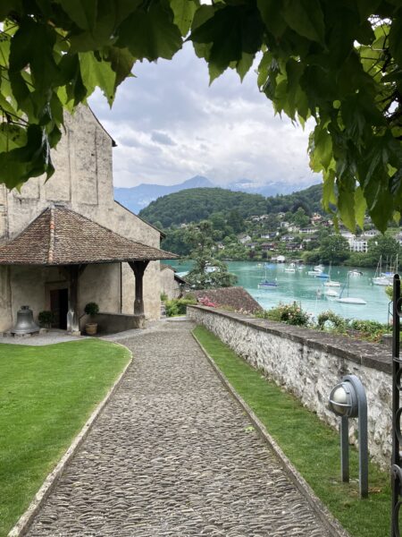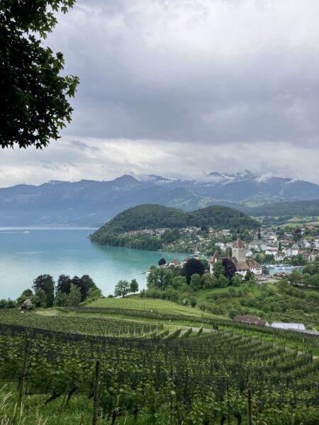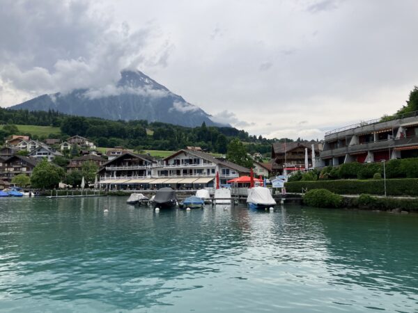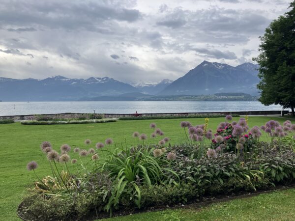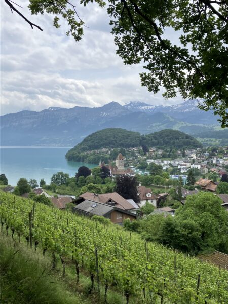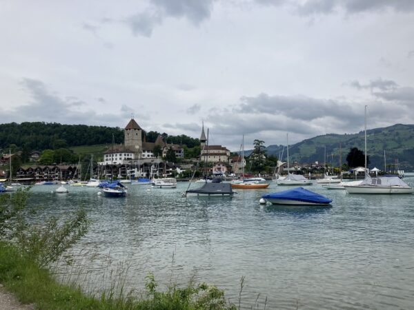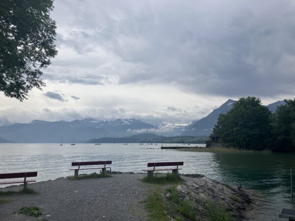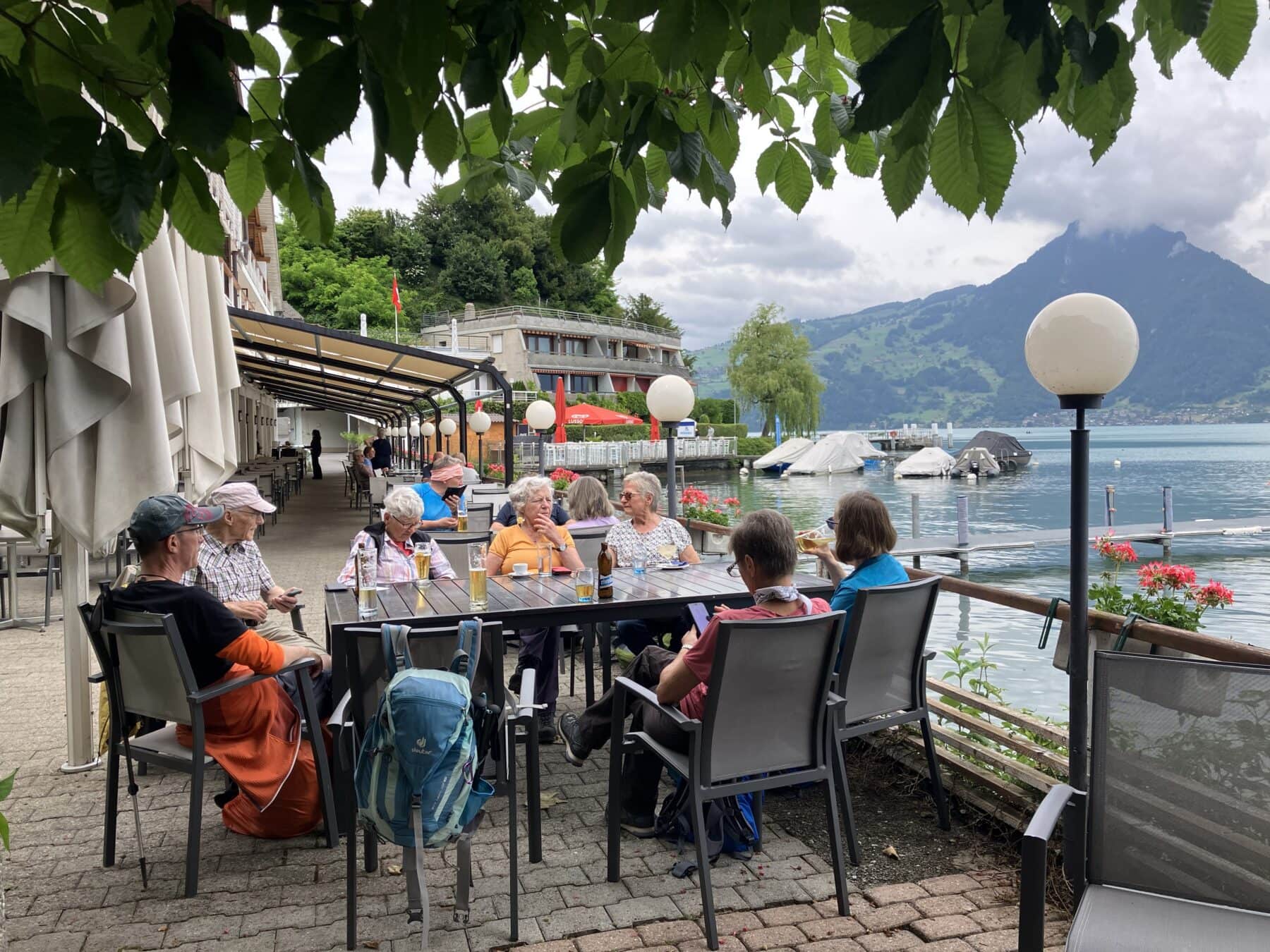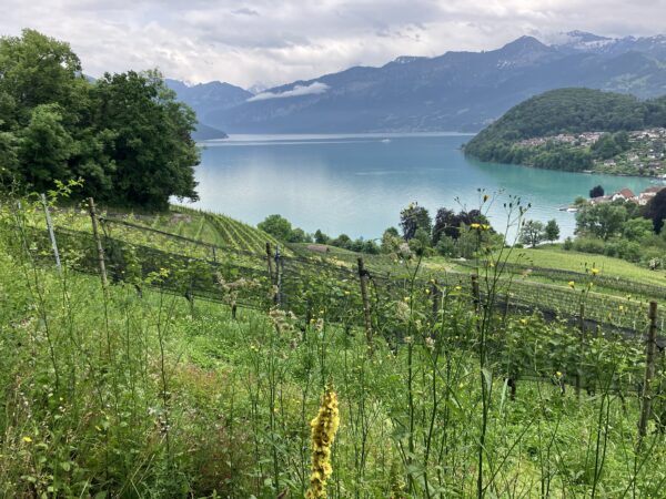 Die Wanderung verlief anfangs entlang des Thunersees. Wir bestaunten von aussen das Schloss Schadau und kurz darauf die Stelle, wo die Bühne für die Thunerseespiele aufgebaut wird. Bald führte der Weg weg vom See zu verschiedenen Aussichtspunkten über dem Thunersee und die umliegenden Berge wie Niesen, Morgetenhorn, Niederhorn, Sigriswiler Rothorn etc. Mittags fanden wir einen gemütlichen Rastplatz im Wald. In Spiez gelangten wir durch den Rebberg wieder zum See. Nach einem «Mountain Ice Cream» folgten wir dem Seeuferweg nach Faulensee, wo uns Roland und Irene erwarteten. Roland hatte die Tour geplant und konnte sie leider selbst nicht leiten. Er spendierte allen ein erfrischendes Getränk und dabei entschieden wir uns, mit dem Schiff nach Thun zu fahren. Die Schifffahrt war sehr schön und danach stiegen wir in Thun um auf den Zug, gerade noch rechtzeitig bevor sich die dunklen Wolken entluden.