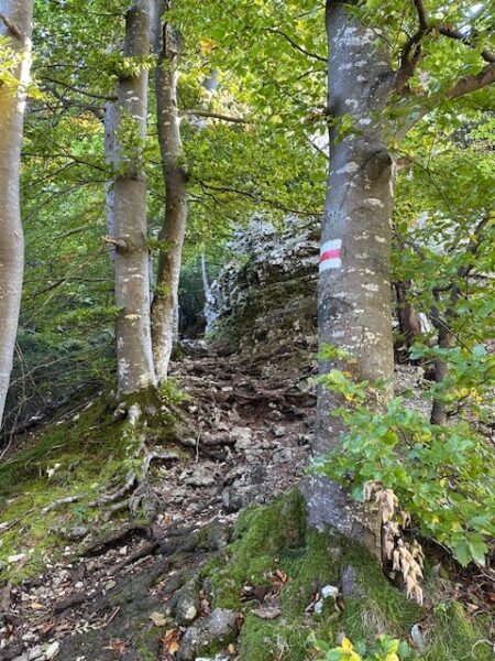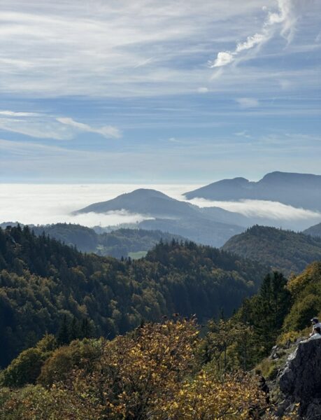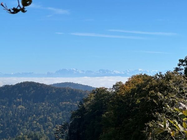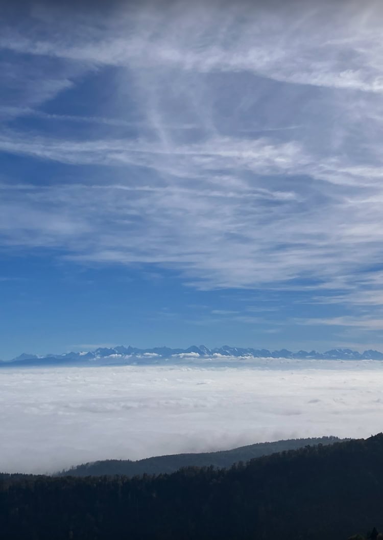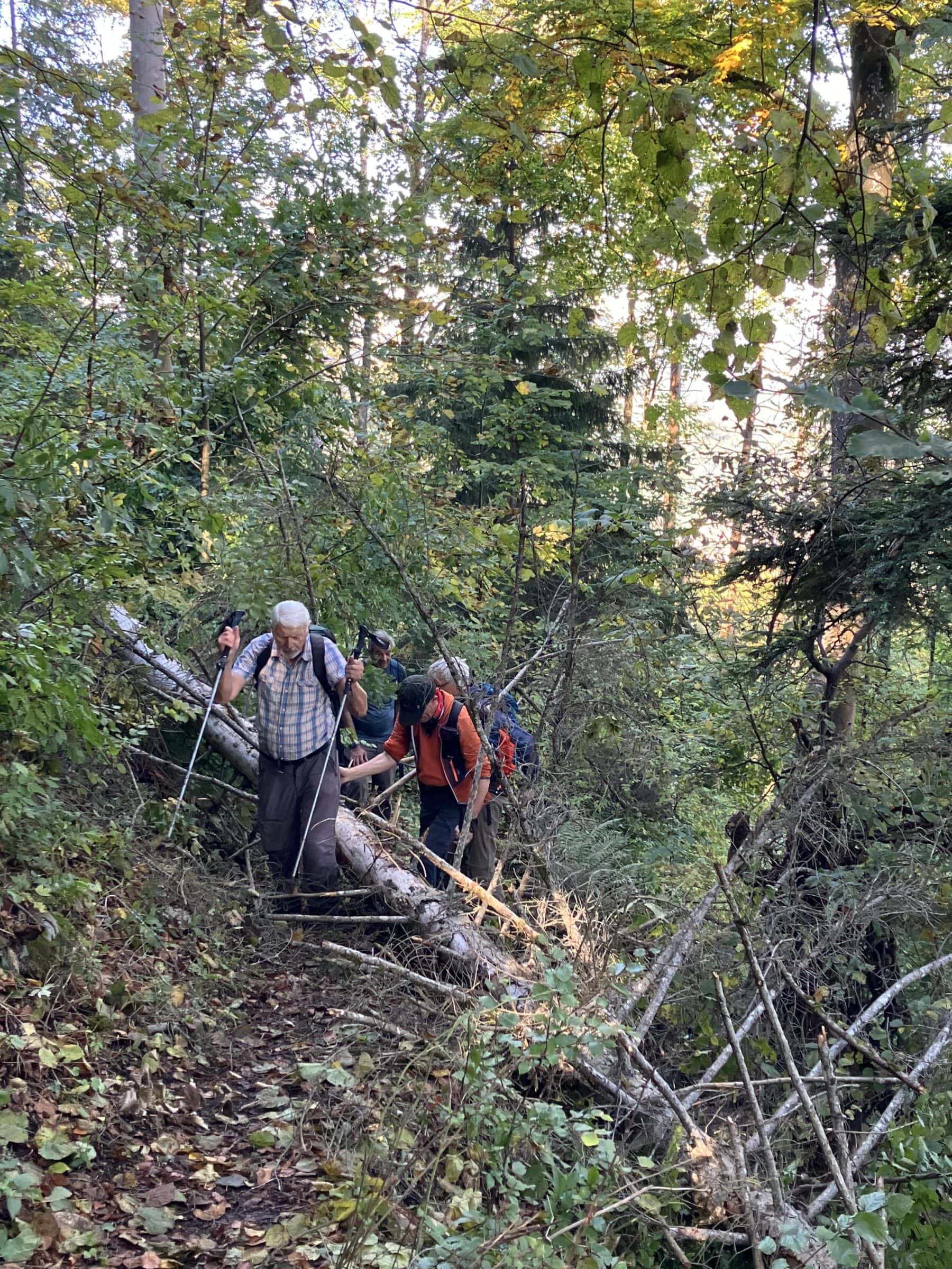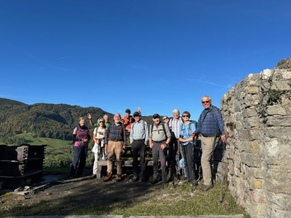 Am Bahnhof Waldenburg war unser Treffpunkt auf 517 m.ü.M. Wir wanderten durchs Stedtli, Adelberg, durchs Törli und oberhalb der ehemaligen Revue steil hinauf ins Gersteltäli. Nach einem gfürchigen Tiefblick ins Stedli kamen wir zur Schlossruine Waldenburg. Nun folgte der weiss-rot-weiss-markierte Bergweg dem Gerstelgrat entlang, wo wir über mehrere umgestürzte Bäume klettern mussten. Vom Panzertürmli aus sahen wir «Bärg und Täli» aber leider keine Gämsen. Auf der Geissfluh entfachten wir ein Feuer zum Bräteln der Würste und Schmelzen des Käses. Über den Chilchzimmersattel ging es weiter an der historischen Tanne vorbei, welche letztes Jahr noch eine 3-fache Krone trug, aber heute leider nur noch einen abgebrochenen Stammrest zeigte. Die Besteigung der Bölchenfluh, 1’096 m.ü.M. lohnte sich heute besonders: die Aussicht war ringsum grossartig mit all den vielen Alpengipfeln. Für den Abstieg benutzten wir die lange Treppe zur Gwidemhöchi und zur Dürstel-Bergwirtschaft. Den Erzenberg-Rütenen entlang gings abschliessend zum Postauto in Langenbruck, welches uns heimwärts zur WB transportierte.