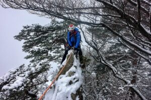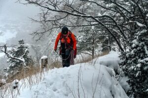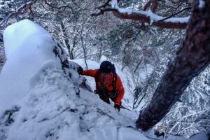 Hoch gehts vom Waldboden auf den Felsgrat und schon kommt die Sicherungsmethode “kurze, schwierige Stelle” zum Einsatz. Auf dem tief verschneiten Grat mit felsigen Abschnitten und solchen in Gehgelände kommen auf diese Weise nahezu alle möglichen und zuvor im Trockenen durchdiskutierten Sicherungstechniken zum Einsatz, vom “gemeinsamen Klettern am laufenden Seil”, über die “Mikroseillänge” bis zum “Seilschaftsablauf” und dem vieldiskutierten “Gehen am kurzen Seil”, wobei der TL ausdrücklich auf die Gefahren und Grenzen dieser Methode verweist.