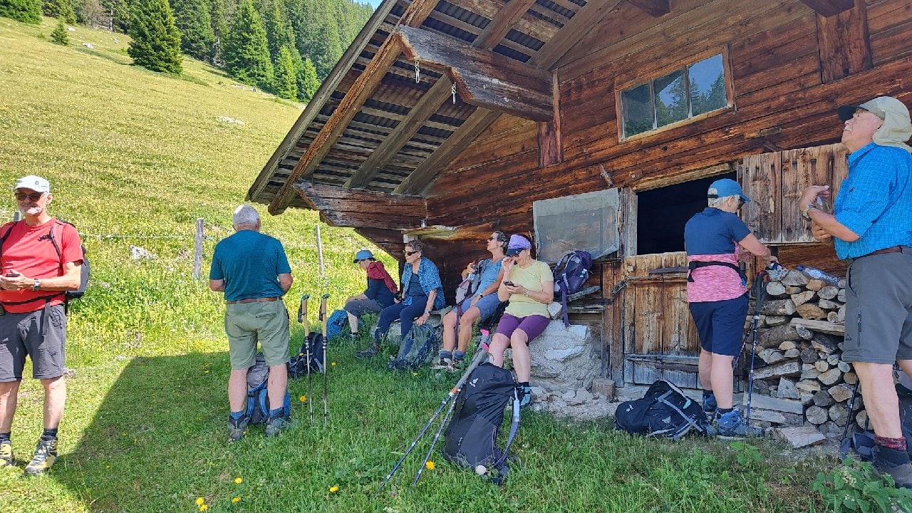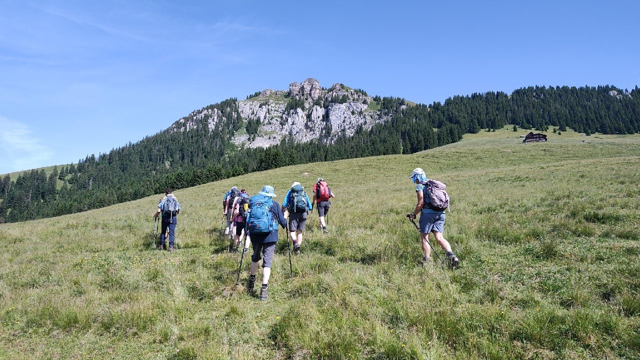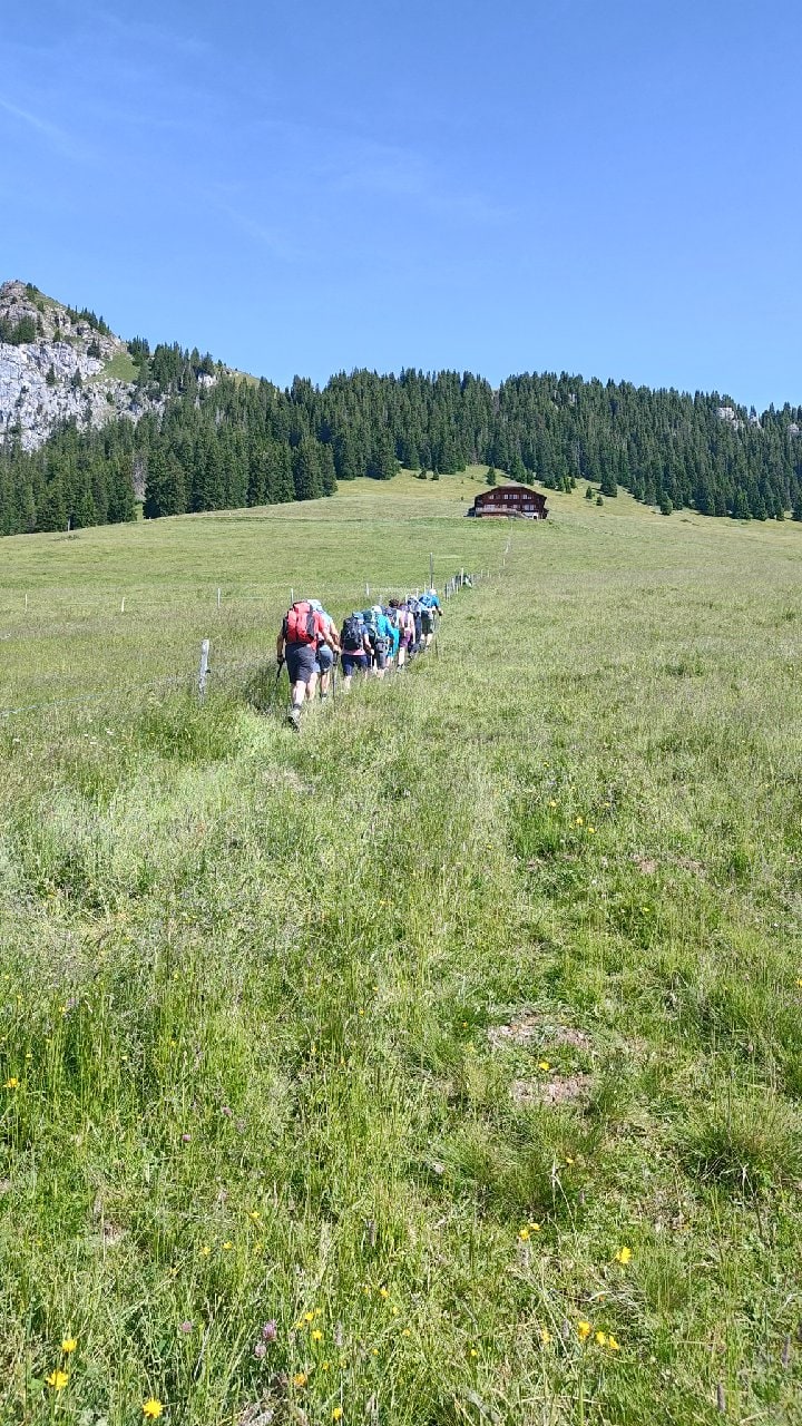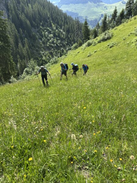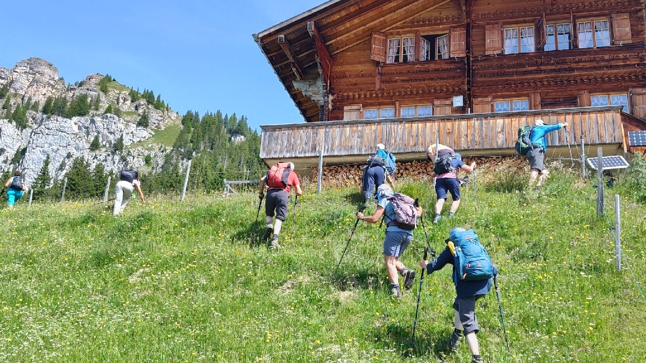 Über den Tagwald wanderten wir der Krete entlang zum Pfaffen und hinunter zur Rinderalp, wo wir im Schatten der Alphütte kühle Getränke geniessen und Alpkäse kaufen konnten. Jetzt folgte ein steiler Abstieg über Feldmöser – Tschugge zum Diemtiger Bärgli, wo uns der Kleinbus wieder abholte und nach Oey-Diemtigen transportierte. Sowohl in Diemtigen wie auch in Oey-Diemtigen gibt es keine Beizen mehr, zum Glück verkauft ein Getränkehändler visàvis vom Bahnhof kostbare Flüssigkeiten und Glacé.
