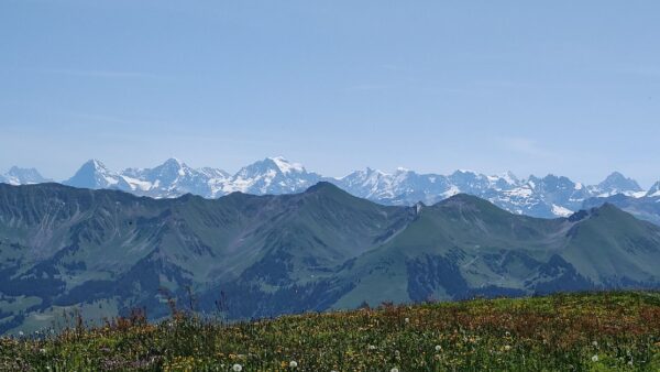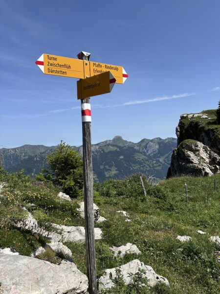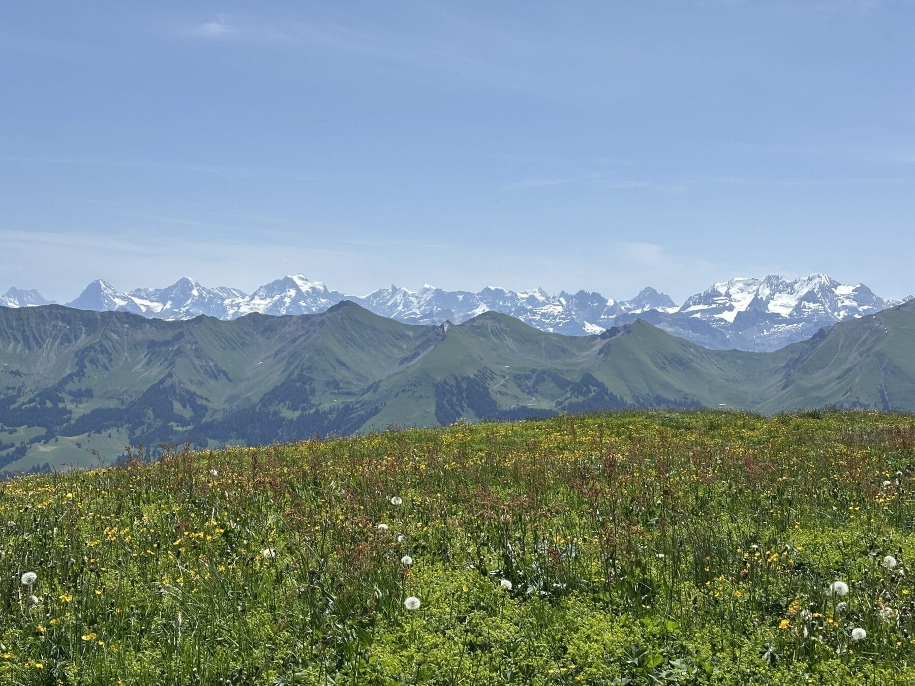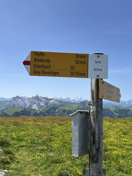 Unser Treffpunkt war am Bahnhof Oey-Diemtigen. Weil leider nur alle 2 Stunden ein Postauto ins Diemtigtal fährt, benutzten wir einen Kleinbus bis oberhalb Zwischenflüh auf 1200 m.ü.M. Hier ging’s gleich steil durch den Gandgraben – Obers Blachli – Vorder Tärfete auf den Turnen, 2079 m.ü.M. Bei wunderbarem Sonnenschein konnten wir nebst dem Mittagslunch rundherum unzählige Berge bewundern: Niesen – Stockhorn – Gantrisch – Gastlosen – die Freiburger Alpen – die Dent du Midi über dem Genfersee – Diablerets – Wildhorn – Wildstrubel – Balmhorn Altels – Blümlisalp – Eiger – Mönch und Jungfrau – Schreckhorn – Wetterhorn und noch viel mehr!